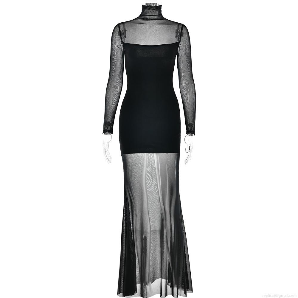 • Women's Sexy Mesh Patchwork Velvet Maxi Dress High Neck Long Sleeve See-through Bodycon Floor Length Evening Party Clubwear Gown Streetwear