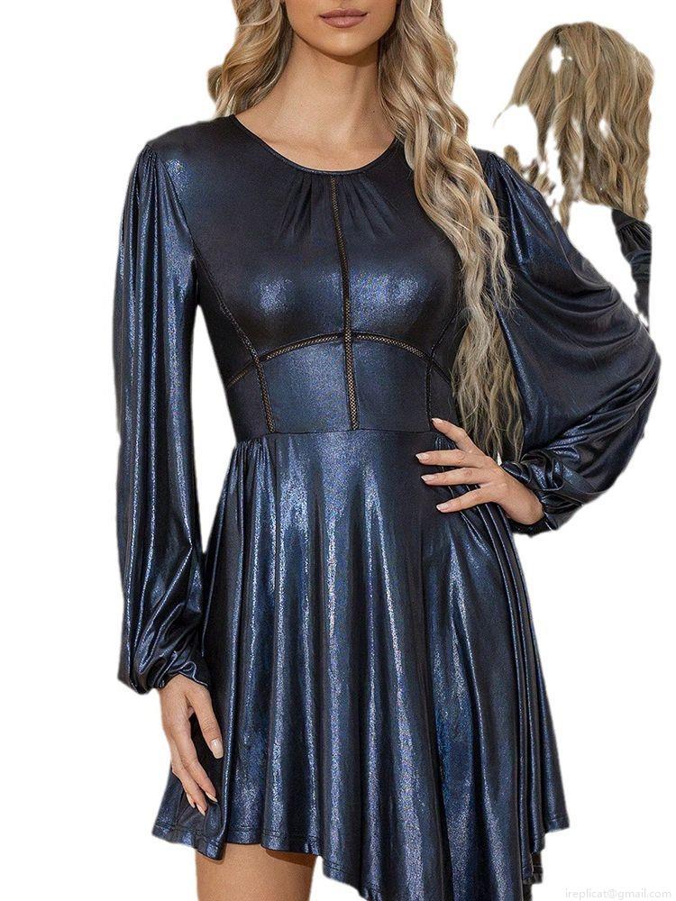 • Women's Sexy Metallic Blue Ruched Mini Dress Long Sleeve Round Neck Bodycon Party Nightclub Dress Shimmering Polyester Spandex Cocktail Outfit