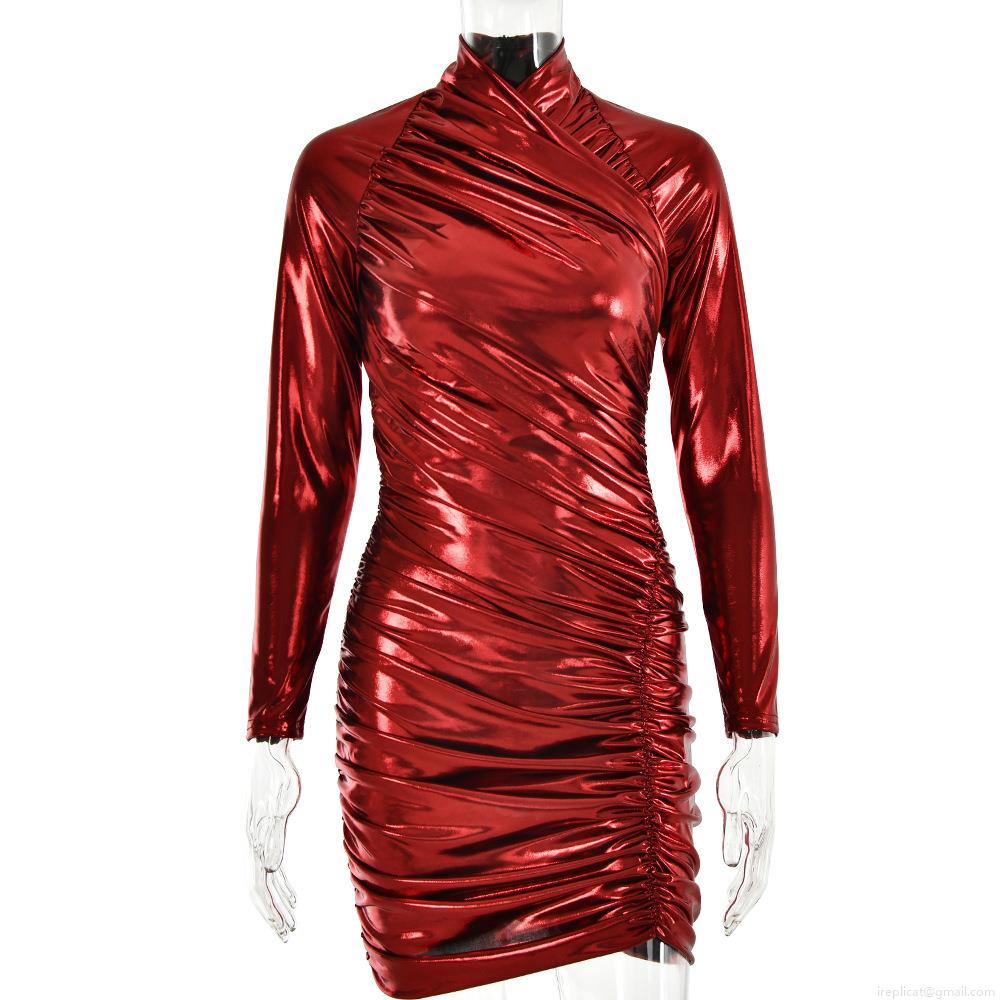 • Women's Sexy Metallic Faux Leather Mini Dress Ruched Bodycon V-Neck Long Sleeve Party Clubwear Night Out Dress