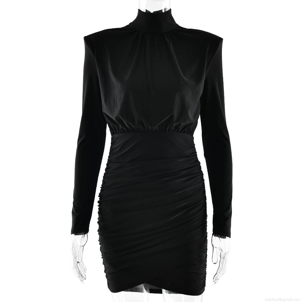 Solid Color, Waist shaping, Shoulder Pads, Turtleneck, Pleated Design, Open Back