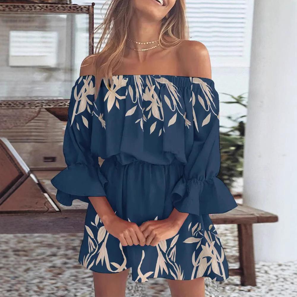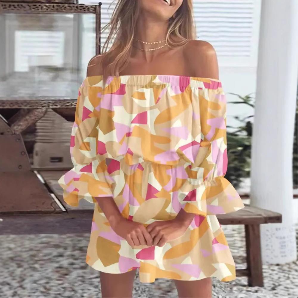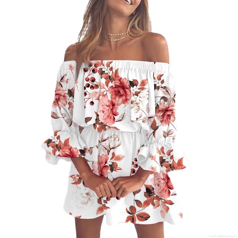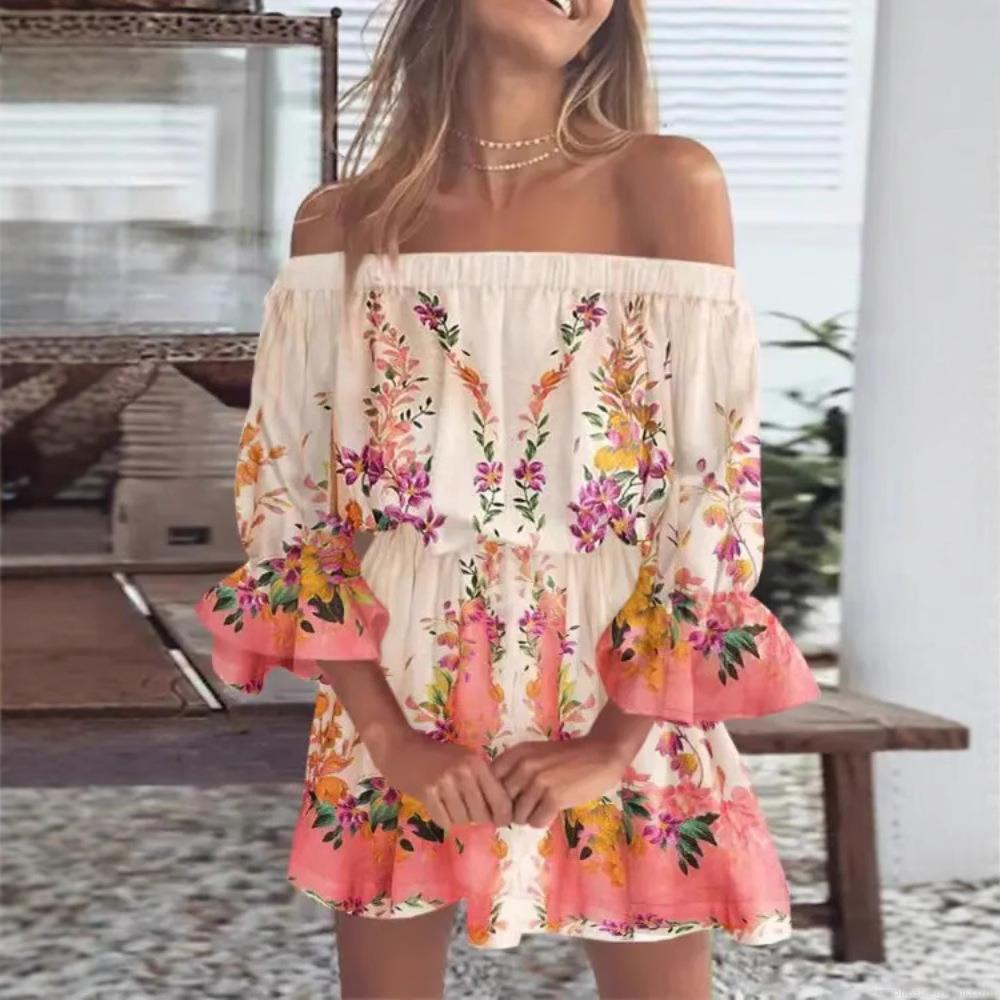 • Women's Sexy Off-Shoulder Floral Print Mini Dress Ruffle Flare Sleeve A-Line Summer Beach Vacation Polyester Spandex Dress