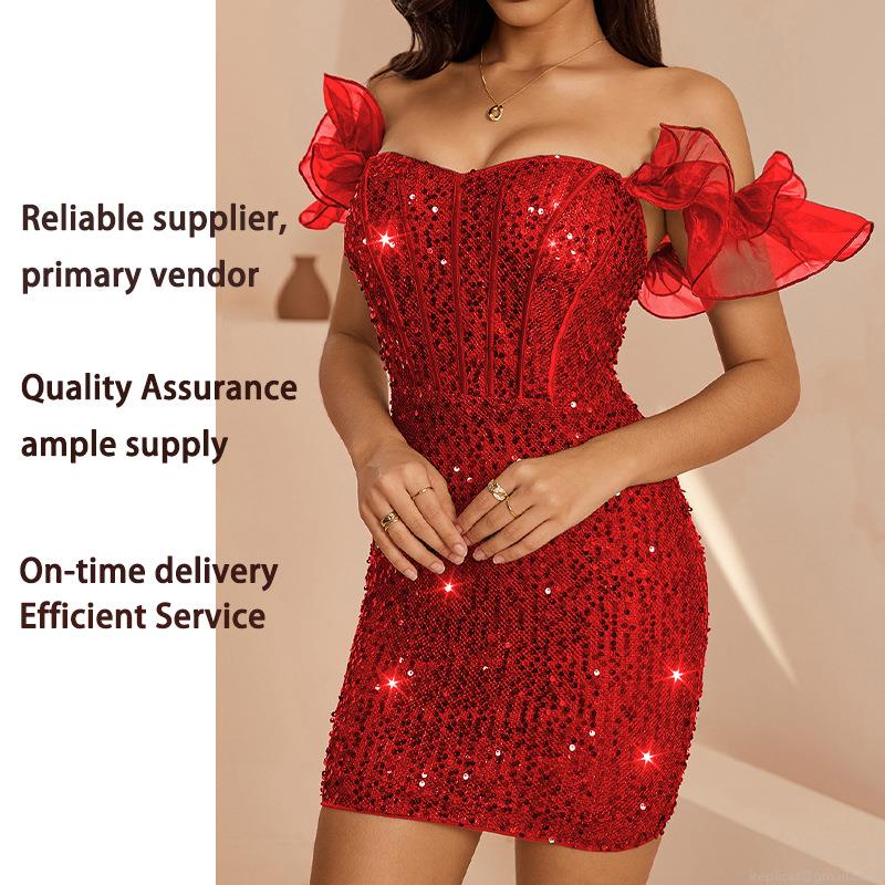 • Women's Sexy Off-Shoulder Sequined Bodycon Mini Dress With Mesh Ruffle Sleeves Shiny Nightclub Party Evening Dress For Women