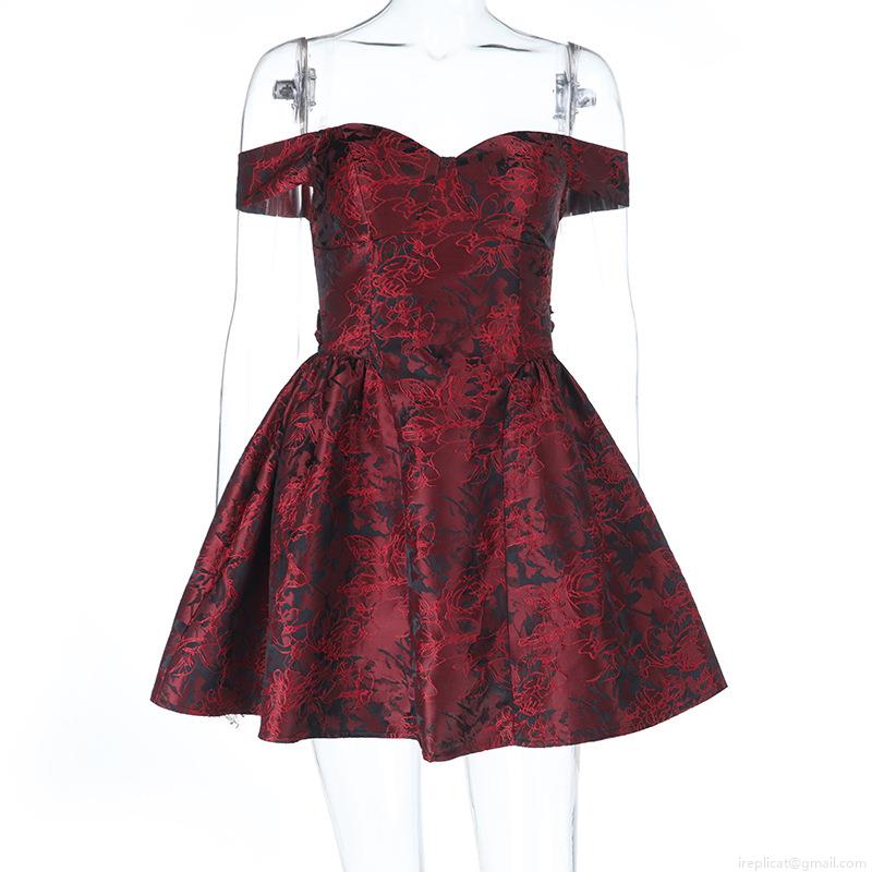 • Women's Sexy Off-The-Shoulder Jacquard Mini Dress Backless Slim Fit Puffy A-Line Short Dress For Party Banquet Elegant Retro Wine Red Jacquard Floral Dress