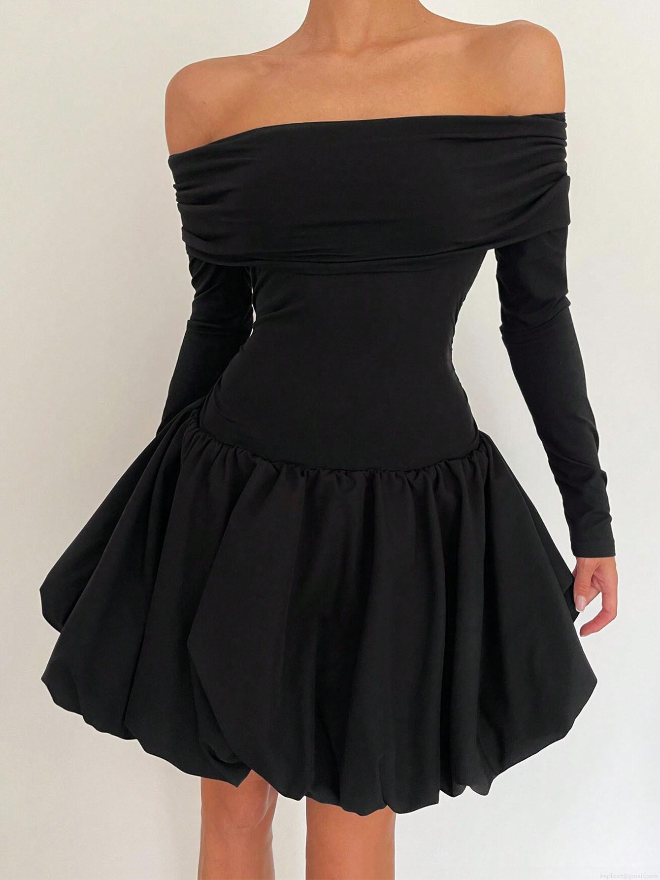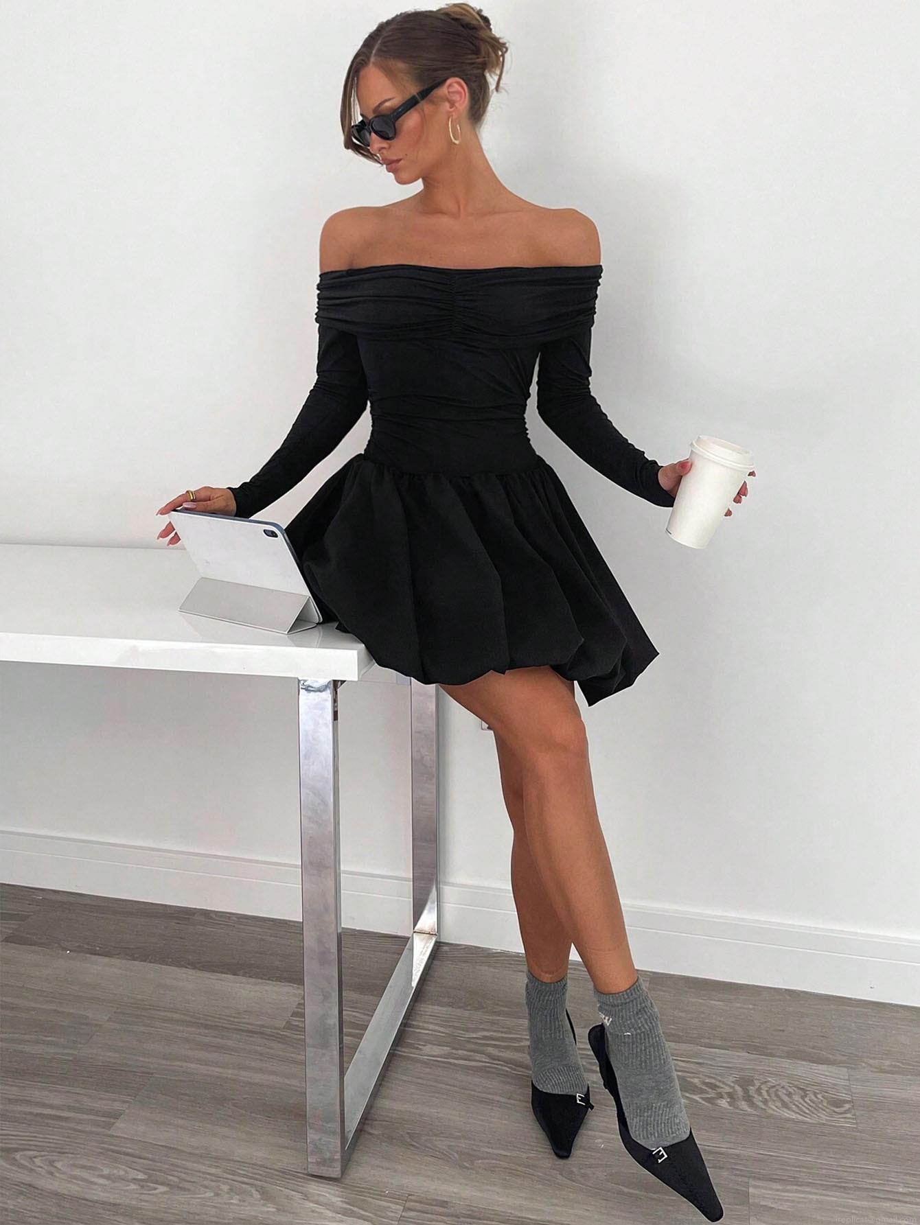 Solid Color, Off-the-shoulder Neckline, Pleated Design, Slim Fit, Bubble Skirt