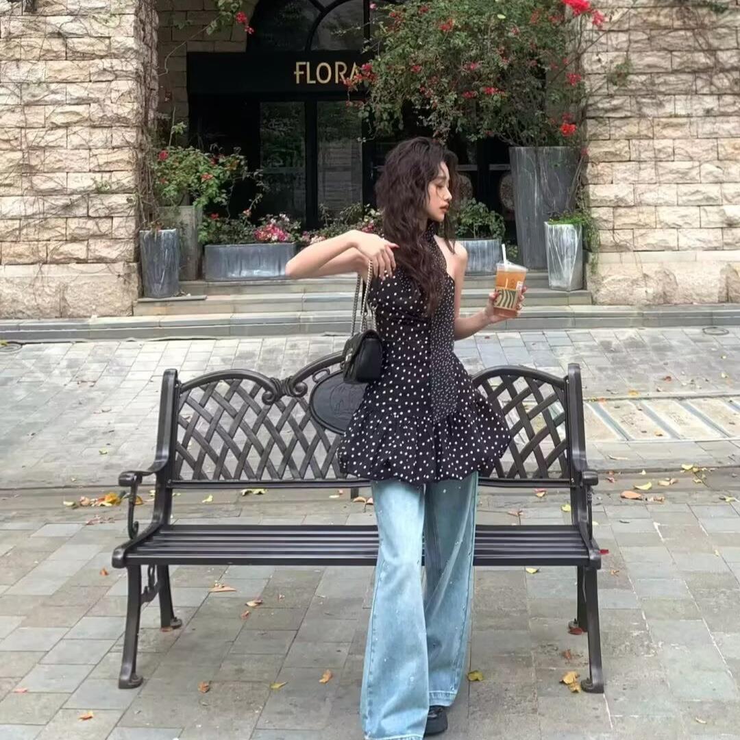 • Women's Sexy One Shoulder Polka Dot Mini Dress Retro Ruched Ruffle Hem Sleeveless Bodycon Short Dress Summer Party Wear Fashion