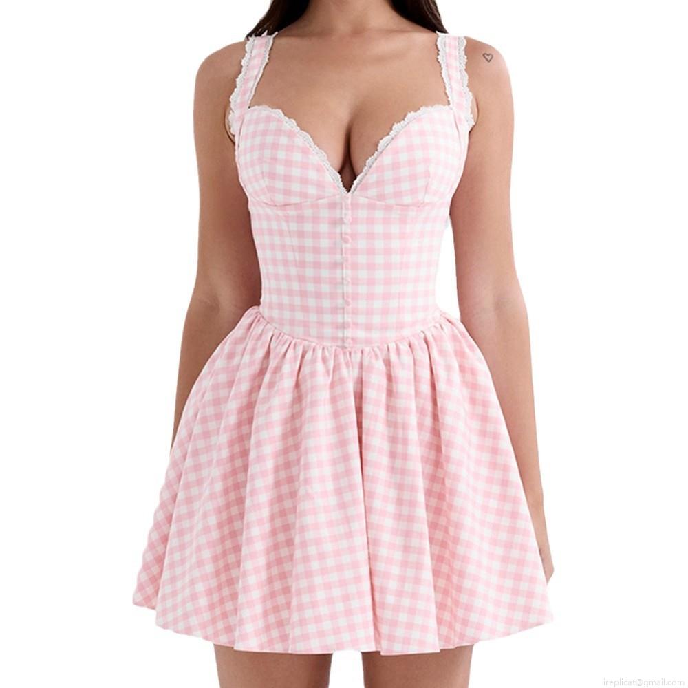 • Women's Sexy Pink Gingham Mini Dress Polyester Lace Trim V Neck Sleeveless Corset Bodycon Sundress Sweet Retro Summer Holiday Party Dress