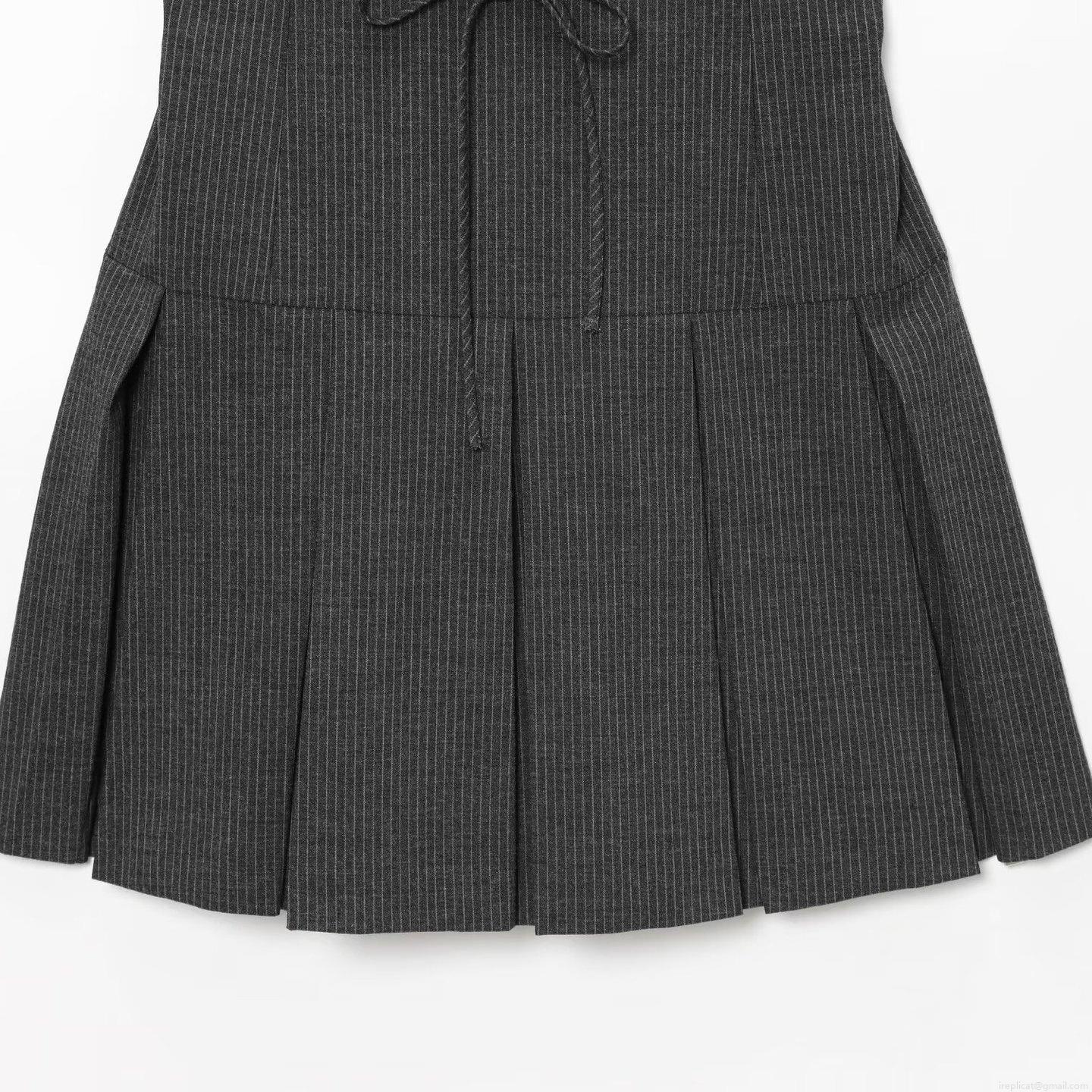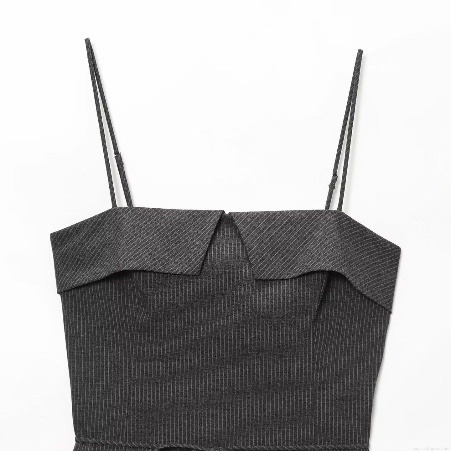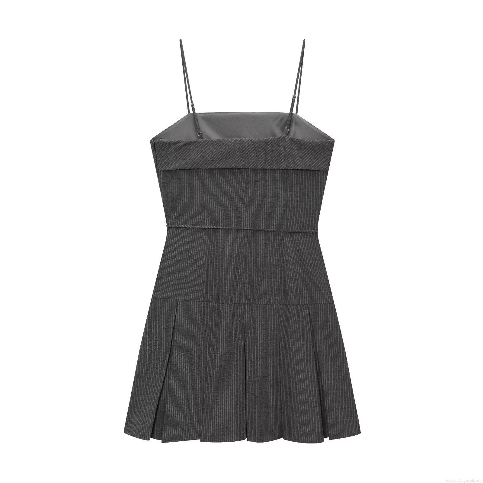 • Women's Sexy Pinstripe Mini Dress Sleeveless Notched Collar Detail Pleated A-Line Dress With Waist Tie Fashion Chic Party Clubwear Short Dress