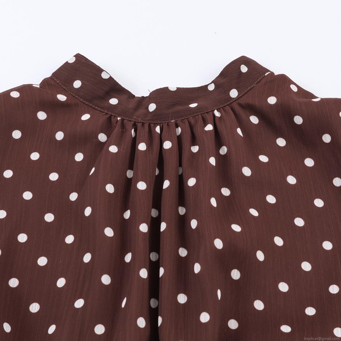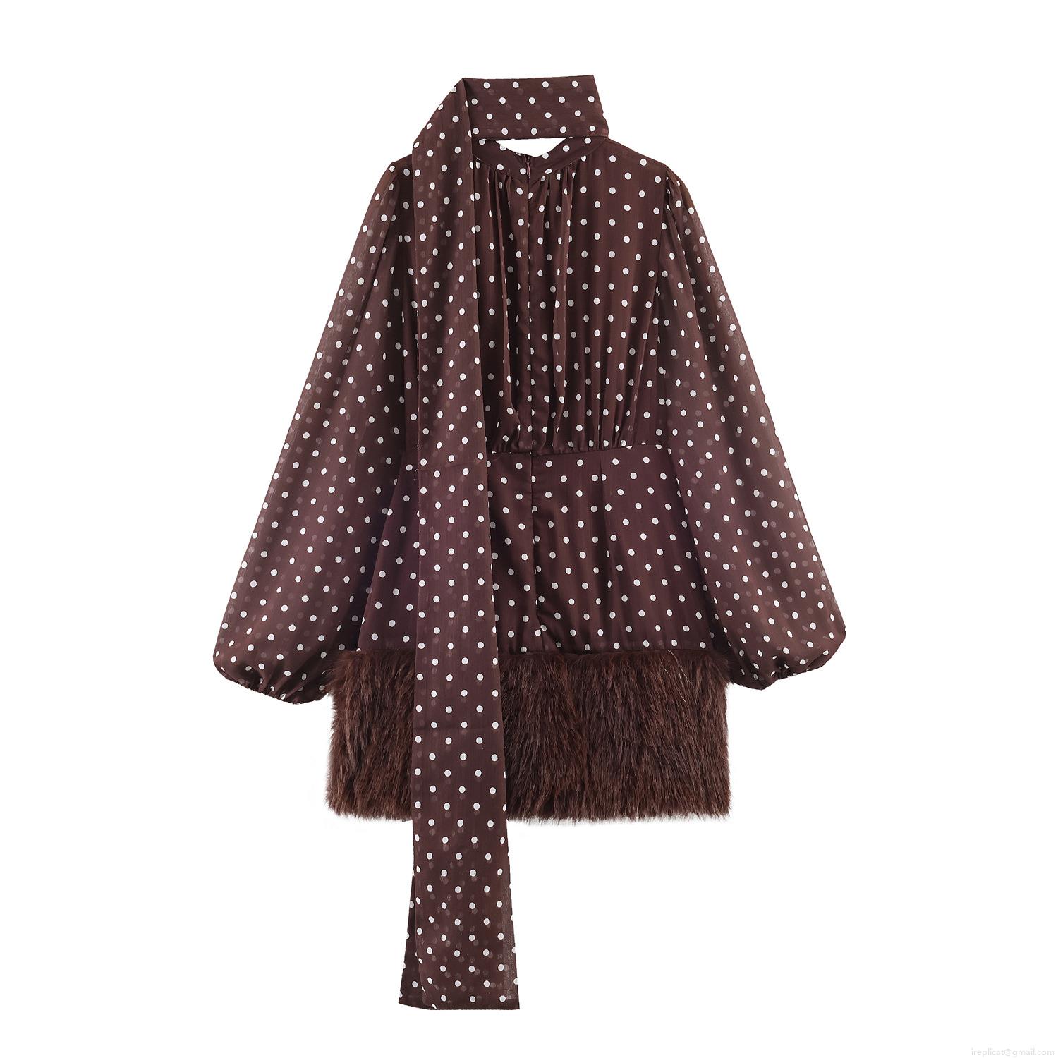 • Women's Sexy Polka Dot Chiffon Dress With Faux Fur Hem Patchwork Tie Neck Lantern Long Sleeve Bodycon Mini Dress For Party Elegant Brown Dress
