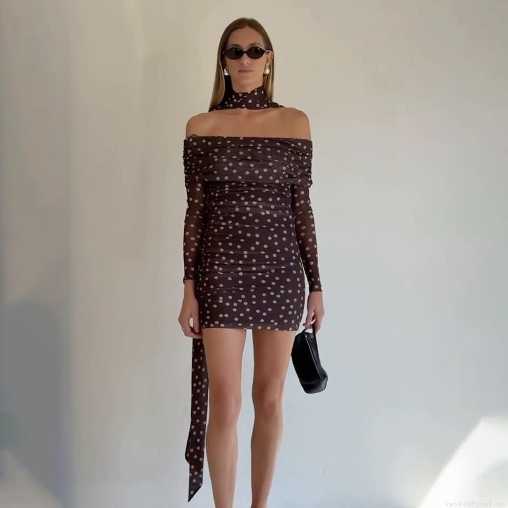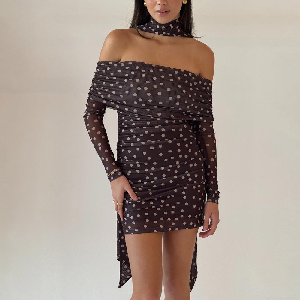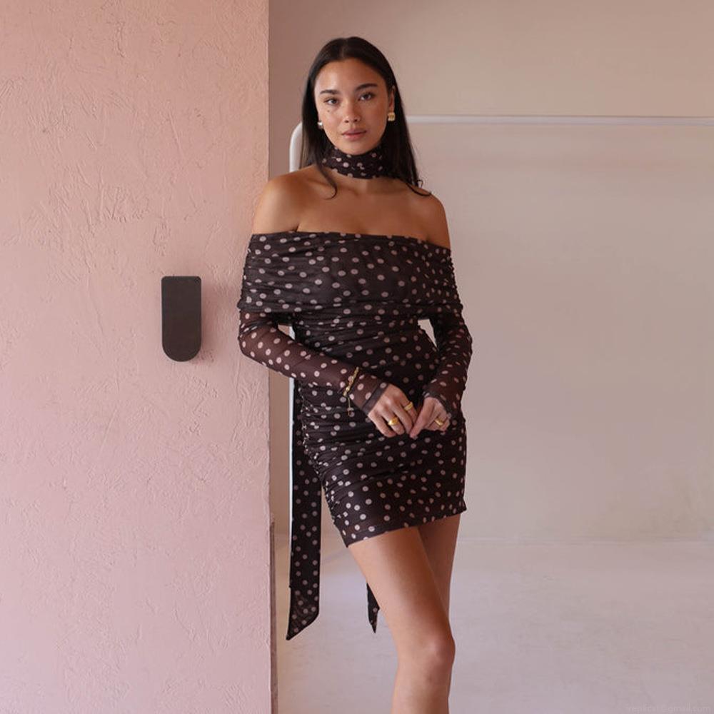 • Women's Sexy Polka Dot Mesh Bodycon Mini Dress With Matching Scarf Off-Shoulder Backless Long Sleeve Polyester Spandex Slim Fit Party Club Dress