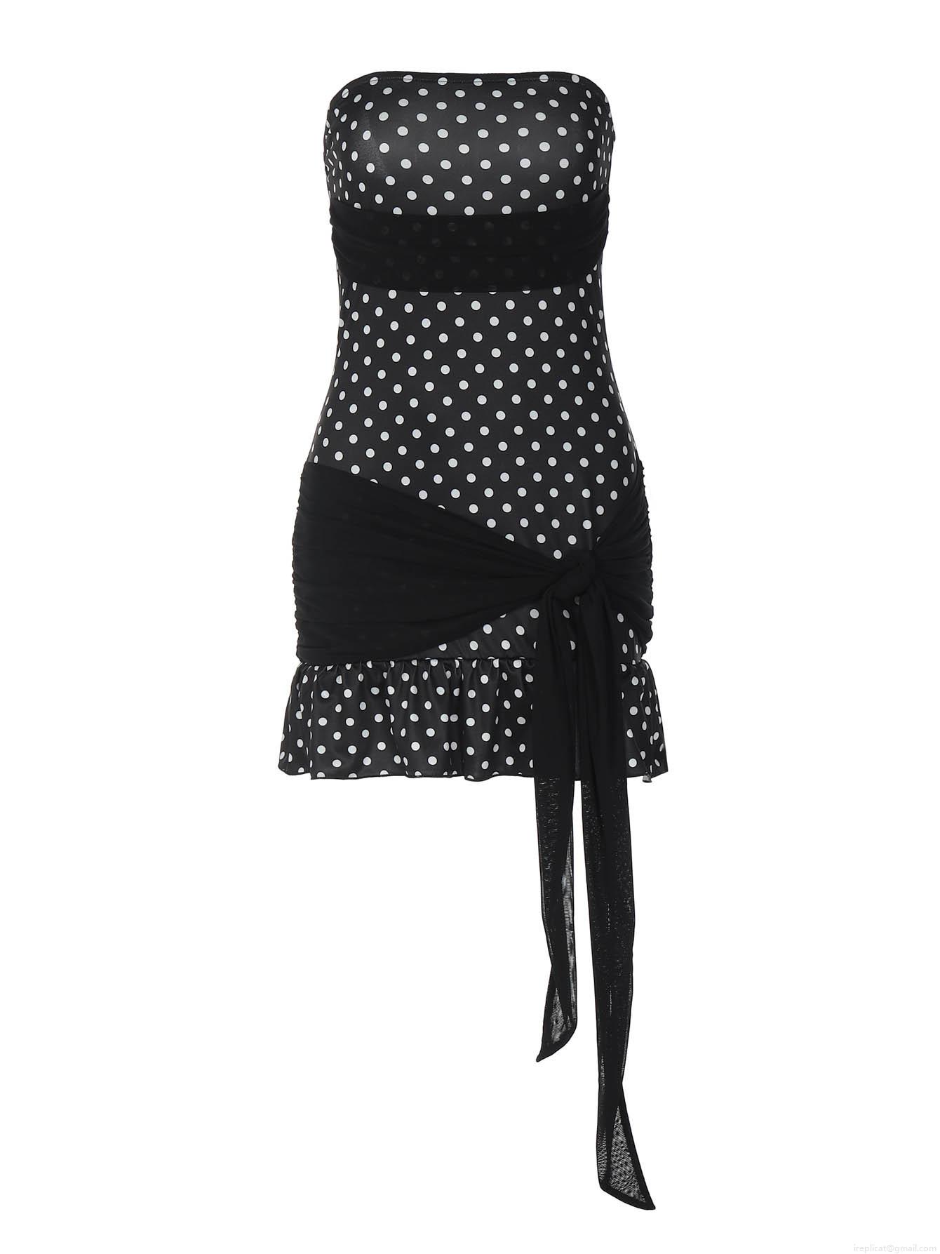 • Women's Sexy Polka Dot Print Bandeau Mini Dress Sweet Off Shoulder Ruffle Hem Bodycon Dress With Waist Tie Fashion Summer Sleeveless Dress For Vacation