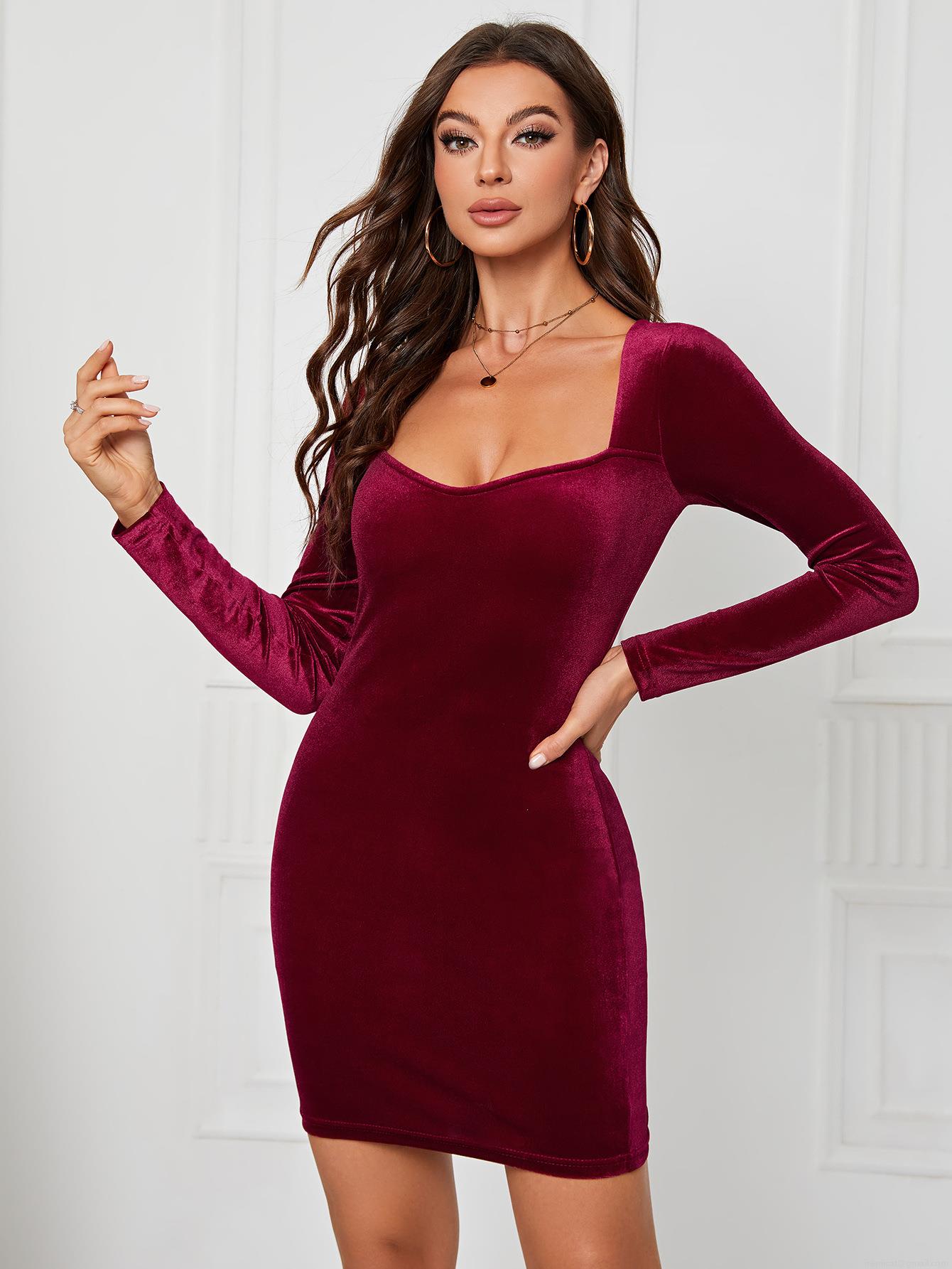 • Women's Sexy Polyester Elastane Velvet Bodycon Mini Dress Square Neck Long Sleeve Slim Fit Party Cocktail Evening Club Short Dress