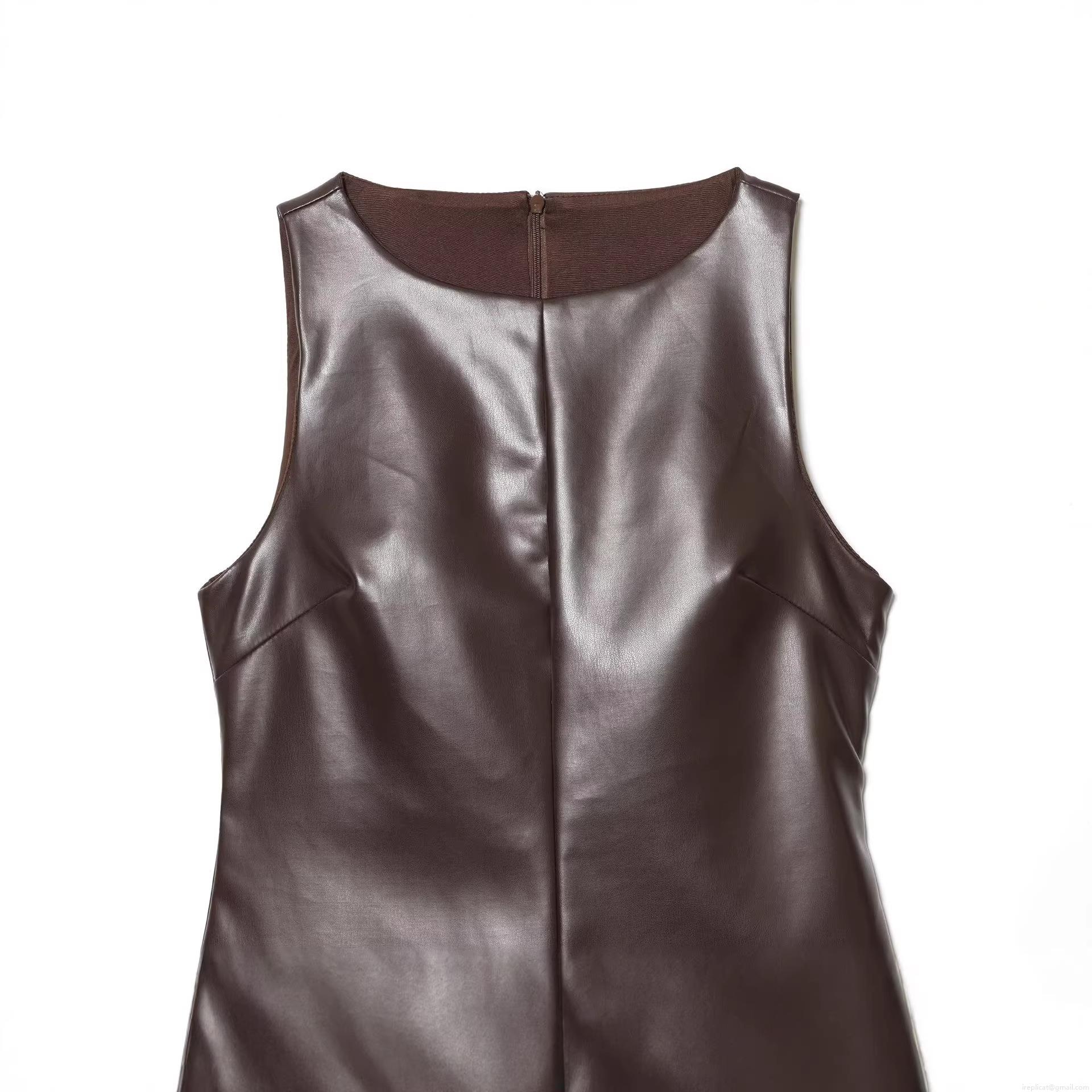 • Women's Sexy PU Faux Leather Sleeveless Mini Dress Slim Fit Ruffle Hem Back Zipper Clubwear Party Jumpsuit Dress With Inner Shorts
