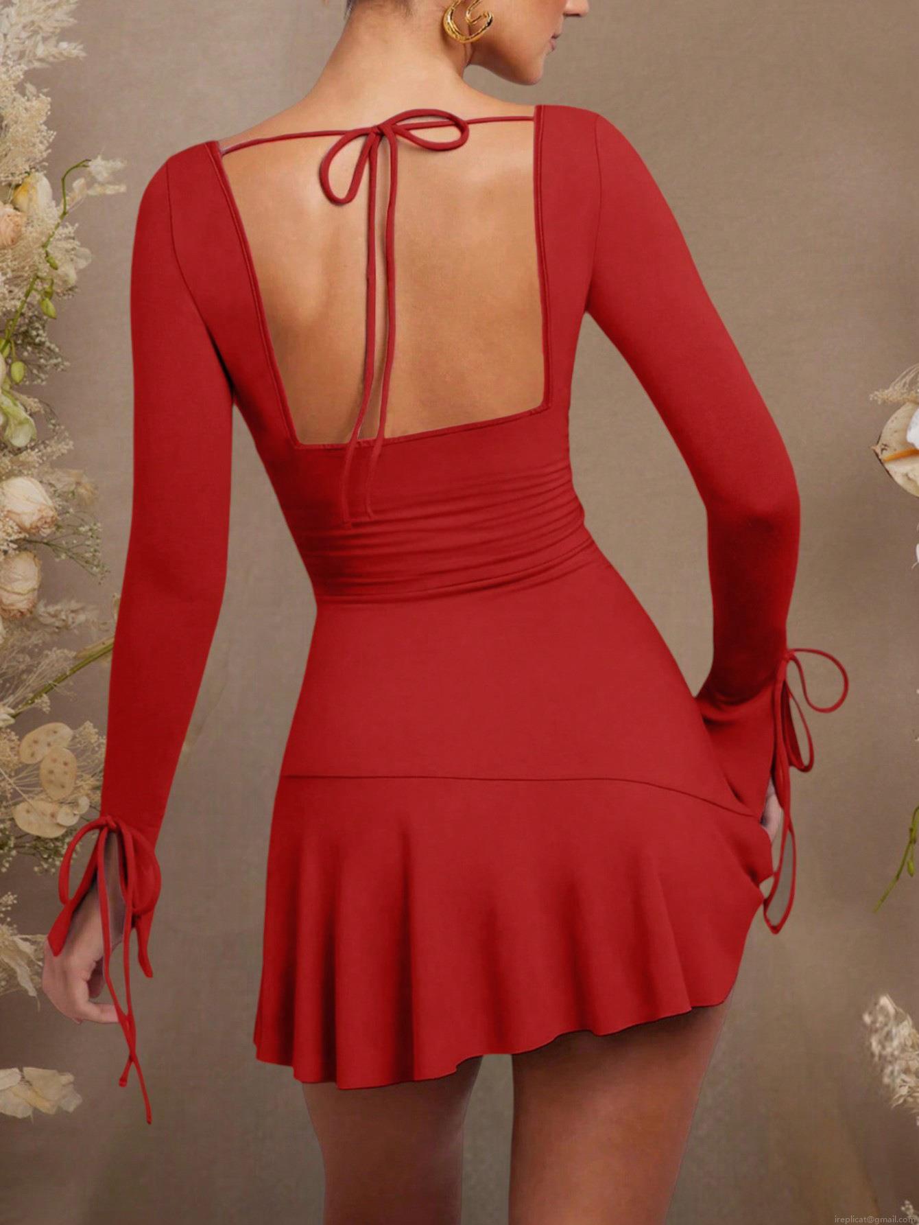 • Women's Sexy Red V-Neck Backless Mini Dress Knitted Polyester Spandex Long Flare Sleeve Ruffle Hem Slim Fit A-Line Dress For Party Club Evening Dating
