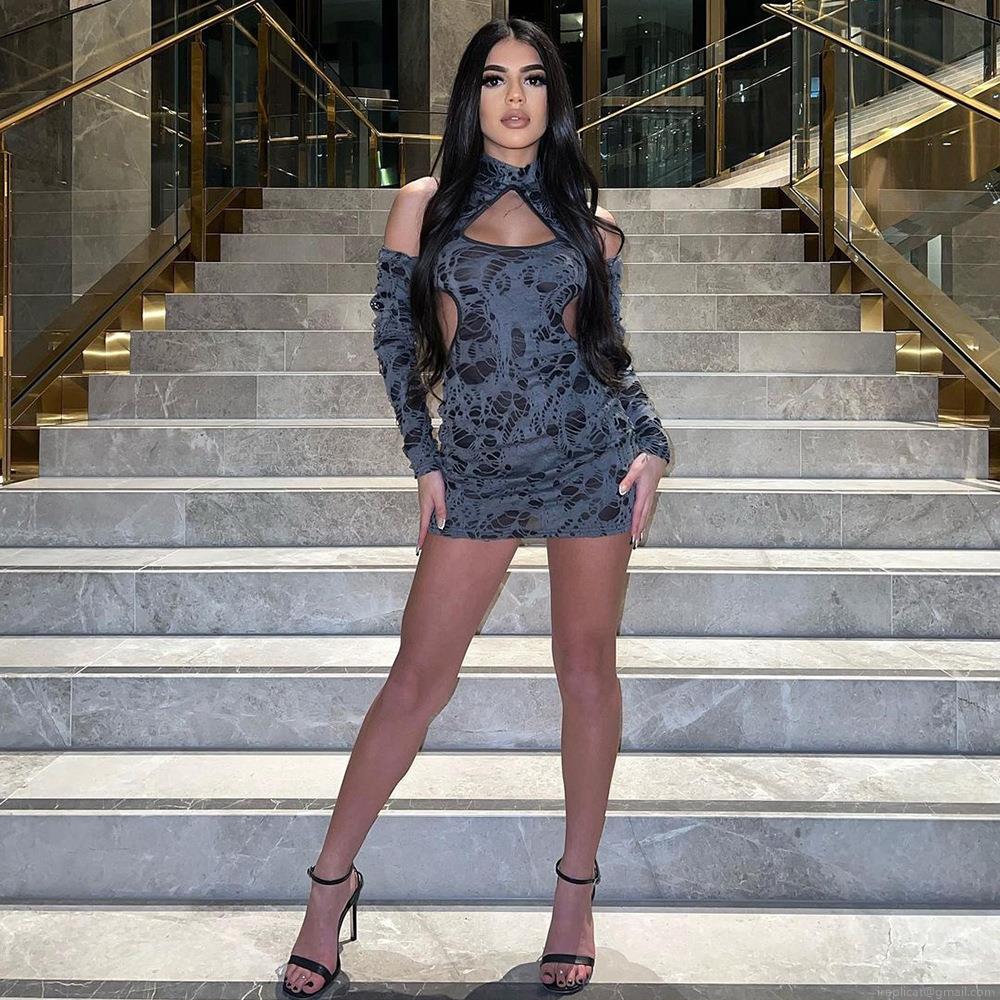 • Women's Sexy Ripped Distressed Knit Mini Dress Two Piece Set With Sleeves Halter Cut Out Hollow Bodycon Party Clubwear Grunge Streetwear