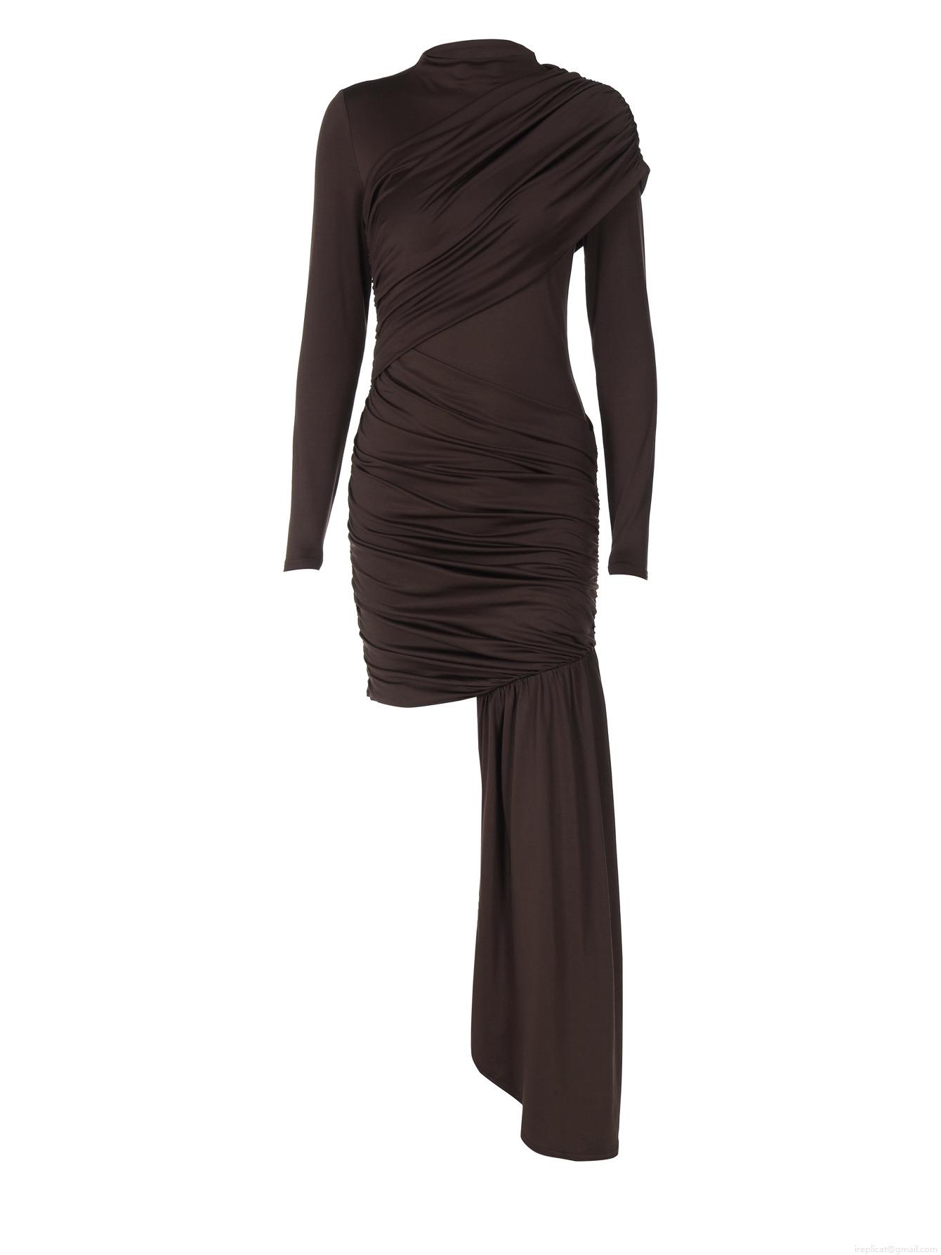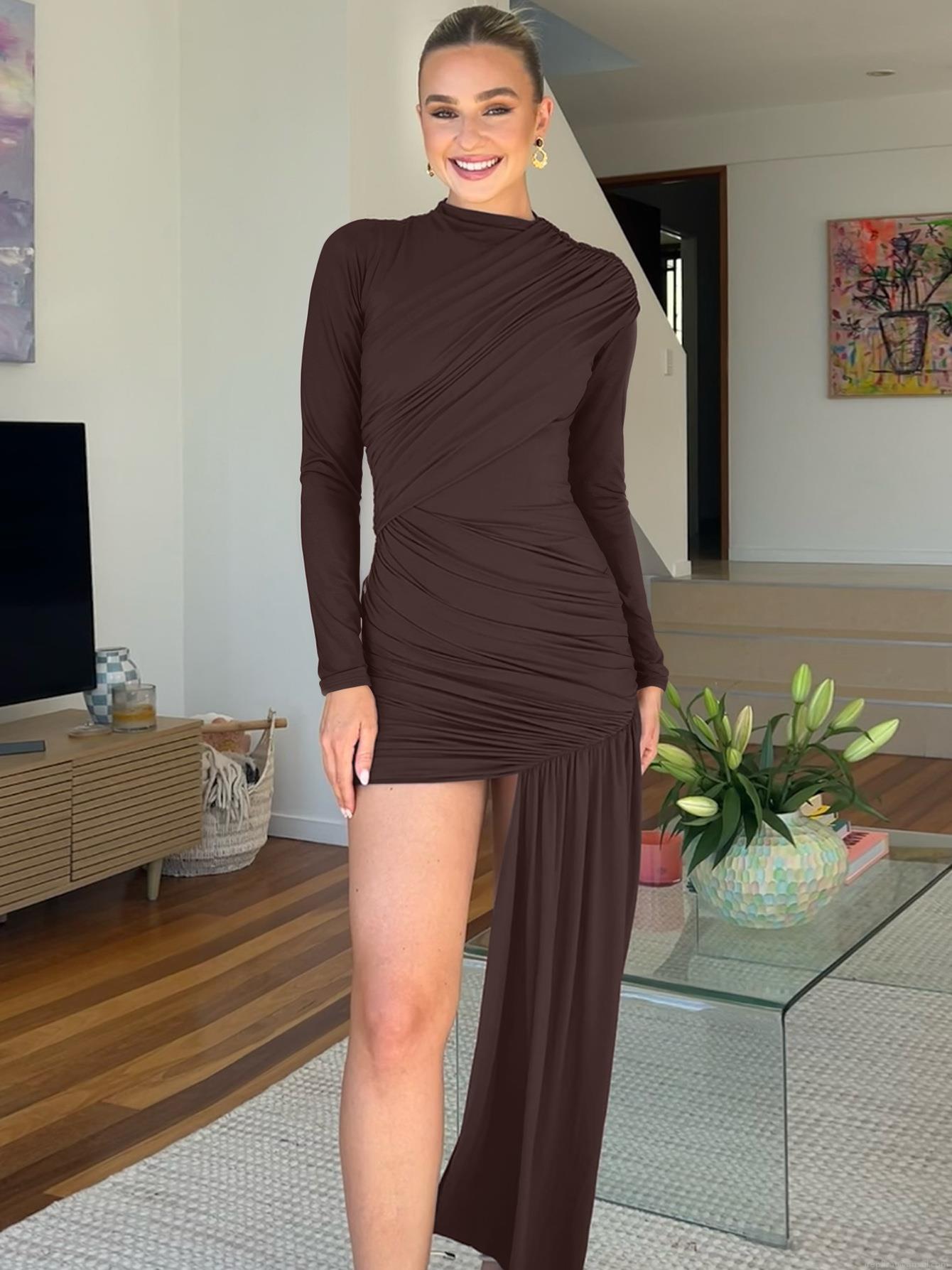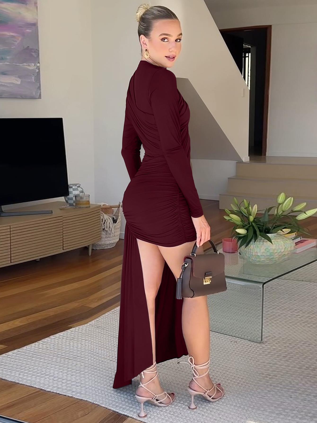 • Women's Sexy Ruched Bodycon Midi Dress Elegant Asymmetric Drape Long Sleeve High Neck Slim Fit Polyester Spandex Solid Color Party Club Dress