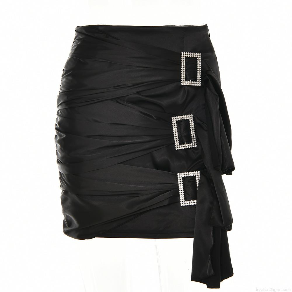 • Women's Sexy Ruched Bodycon Mini Skirt High Waist Satin Skirt With Three Square Rhinestone Buckles For Party Nightclub Clubwear