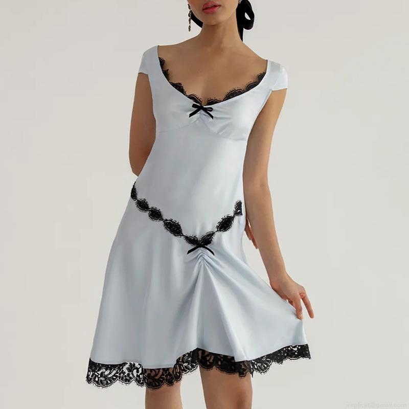 • Women's Sexy Satin Mini Dress Black Lace Trim Patchwork V-Neck Bow Sleeveless Slip Party Clubwear Slim Fit Short Dress