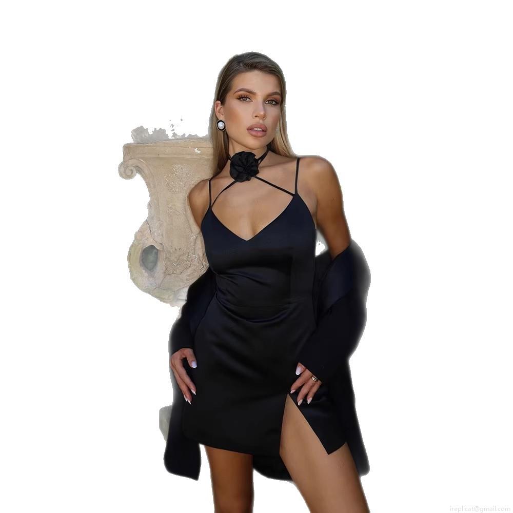 • Women's Sexy Satin Mini Dress V-Neck Backless Side Slit Bodycon Slip Dress With 3D Flower Choker Elegant Party Clubwear Sleeveless Summer Sundress