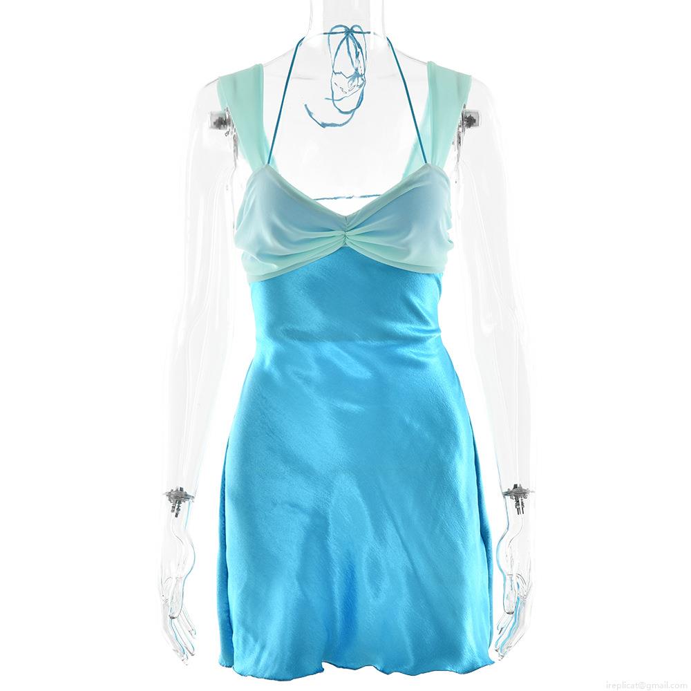 • Women's Sexy Satin Patchwork Backless Cami Mini Dress V-Neck Sleeveless Lace Up Slim Fit Short A-Line Dress for Summer Party Night Out Clubwear