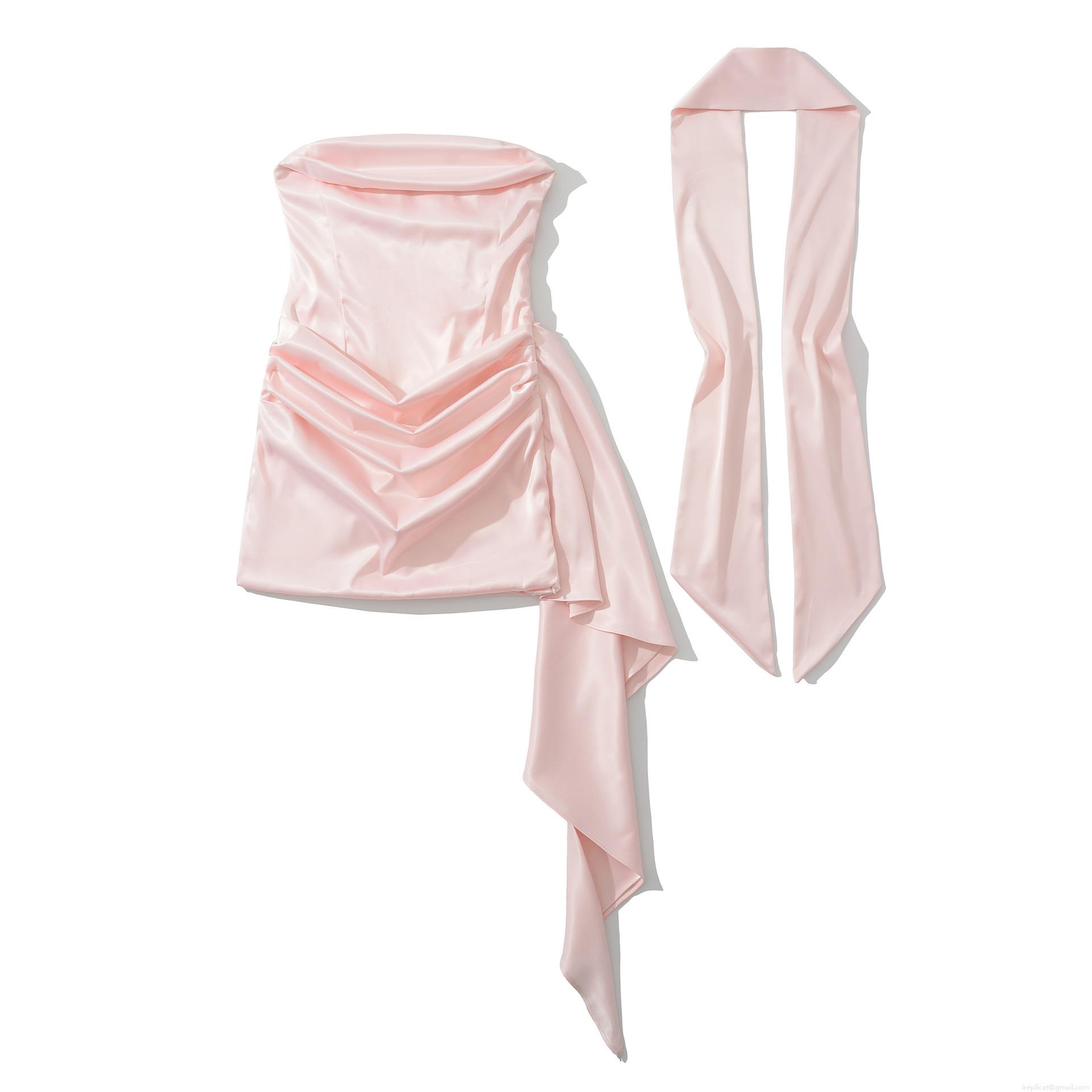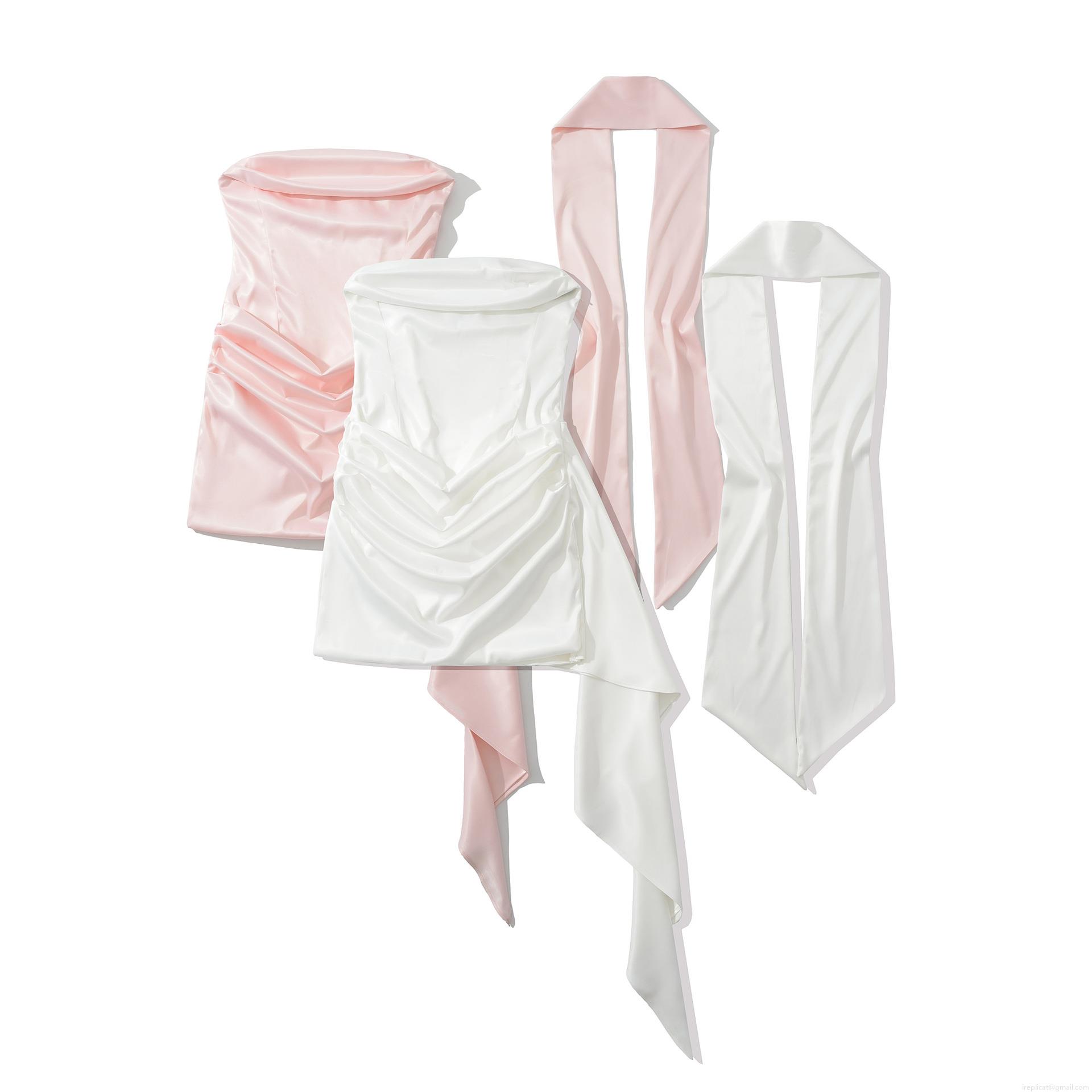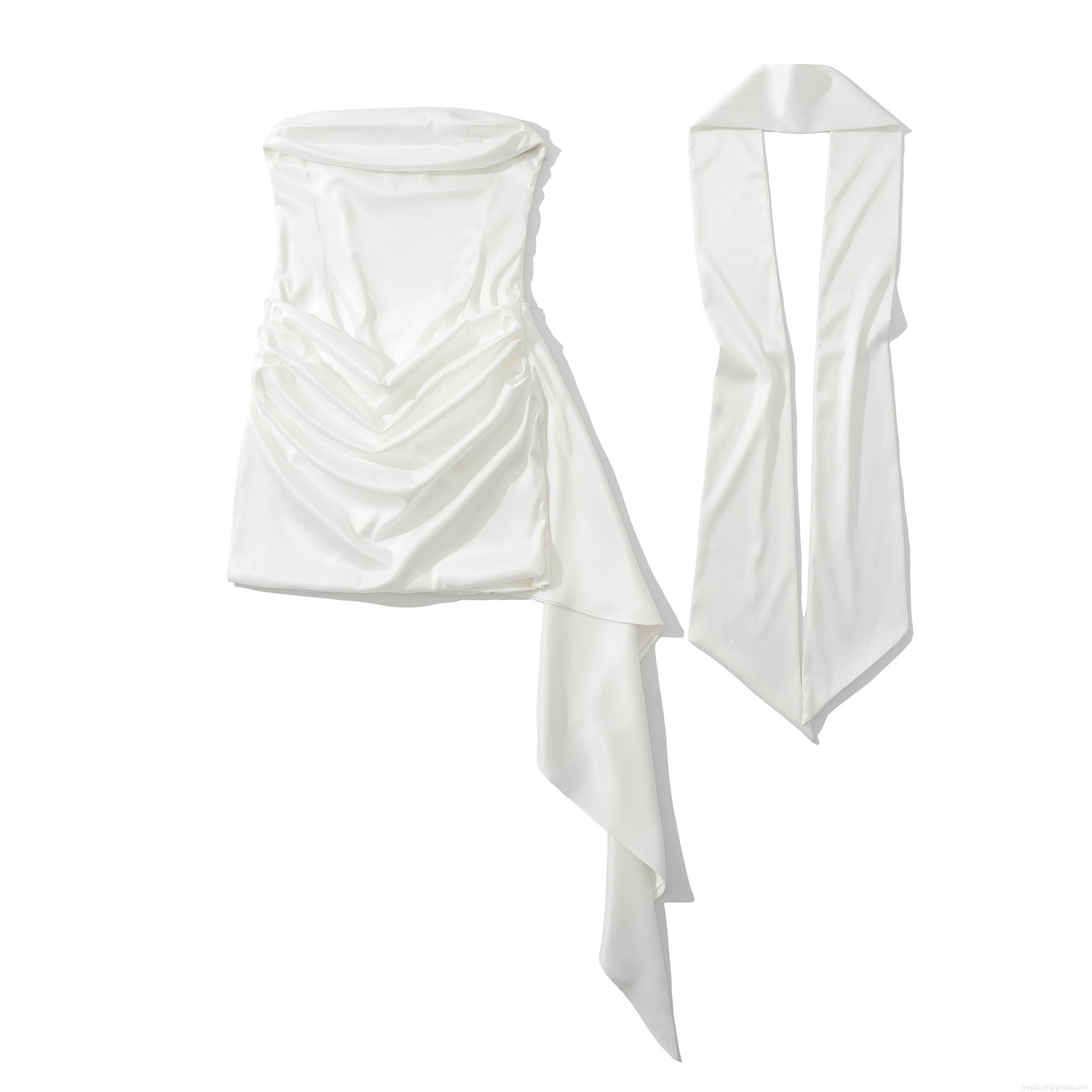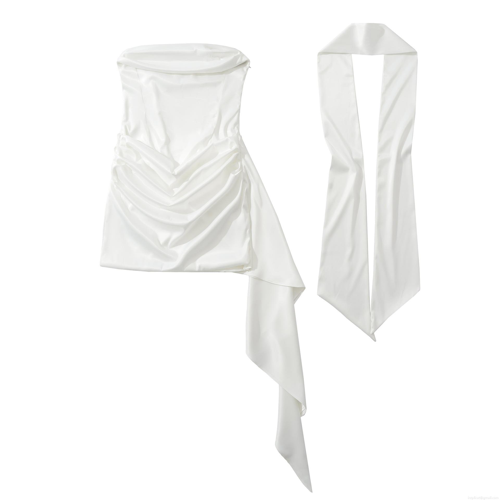 • Women's Sexy Satin Ruched Mini Dress With Matching Scarf Strapless Bodycon Summer Party Clubwear Elegant Solid Color Sleek Evening Short Dress