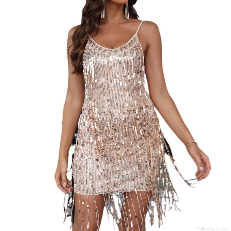 • Women's Sexy Sequin Tassel Mini Dress Sparkling Spaghetti Strap Bodycon Party Evening Club Dress Glamorous Champagne Gold Cocktail Dress for Women