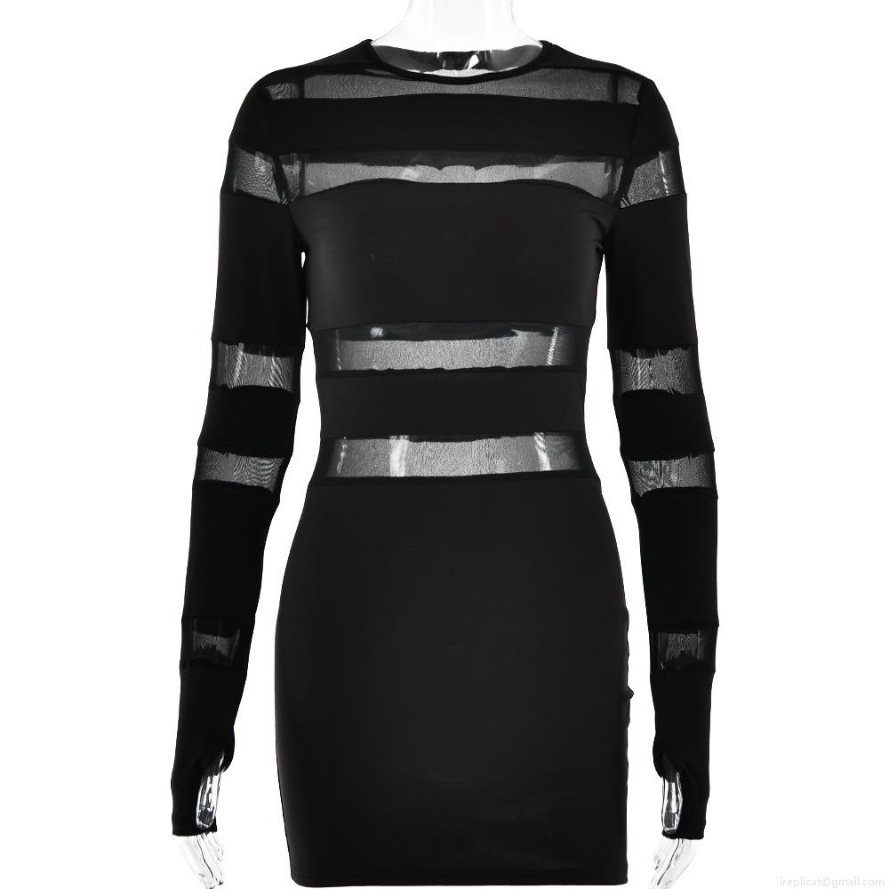 • Women's Sexy Sheer Mesh Patchwork Bodycon Mini Dress Long Sleeve Round Neck Transparent Striped Slim Fit Clubwear Party Night Out Trendy Streetwear Dress