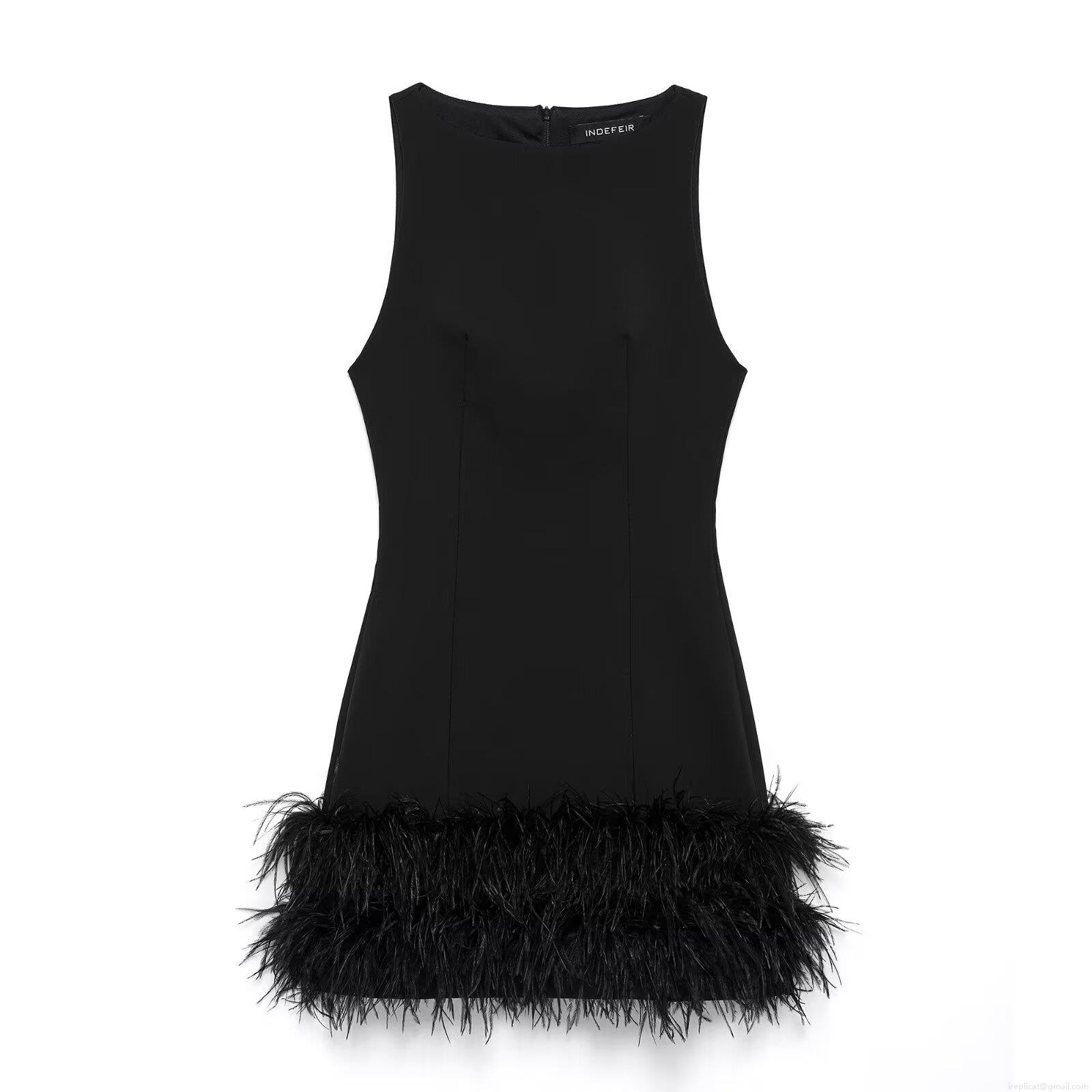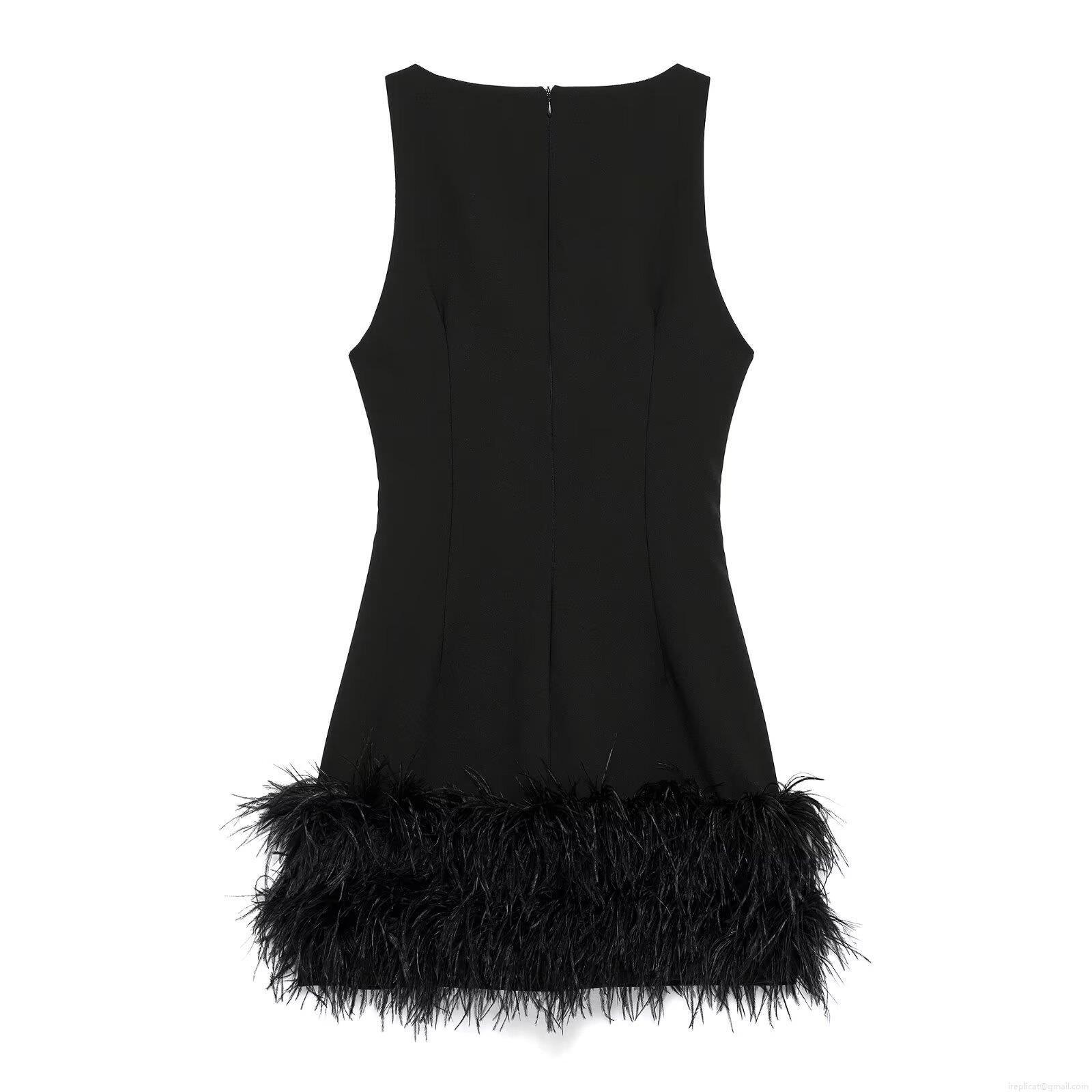 Women's Sexy Sleeveless Round Neck Mini Dress Elegant Black Polyester Feather Trim Bodycon Party Clubwear A-Line Dress