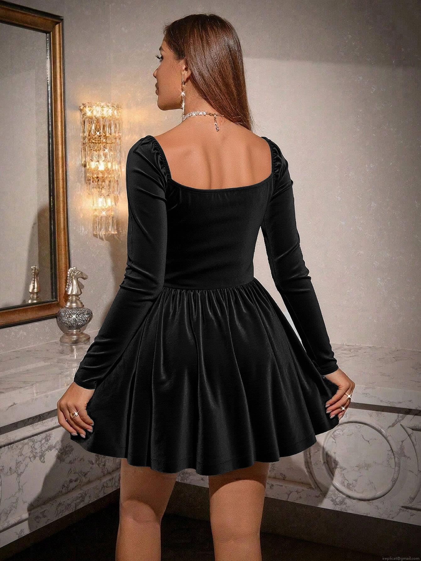 • Women's Sexy Square Neck Velvet Mini Dress Slim Fit Long Sleeve Bodycon Party Dress With Rhinestone Bow Decorations For Evening Wedding Cocktail Ladies Clothing