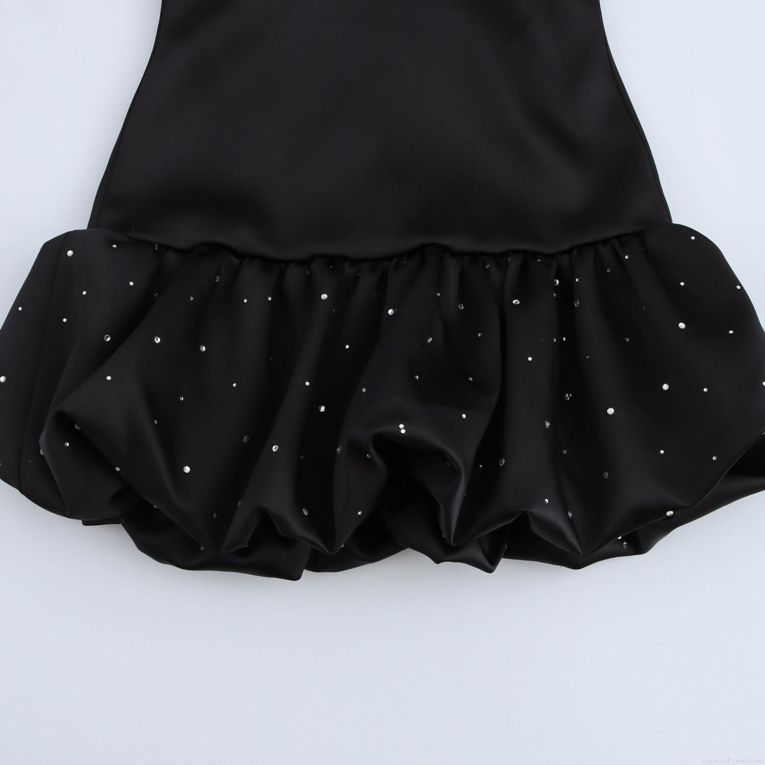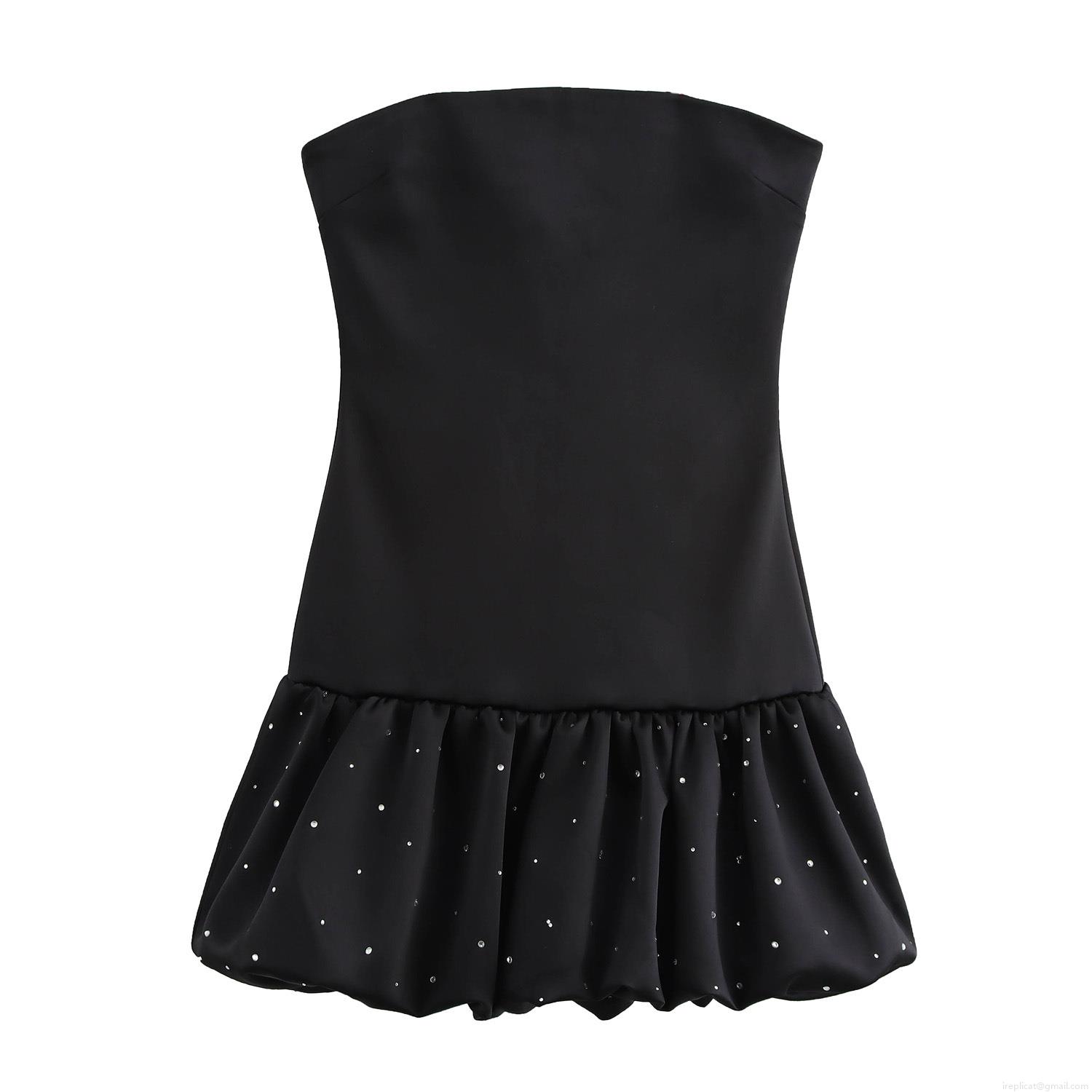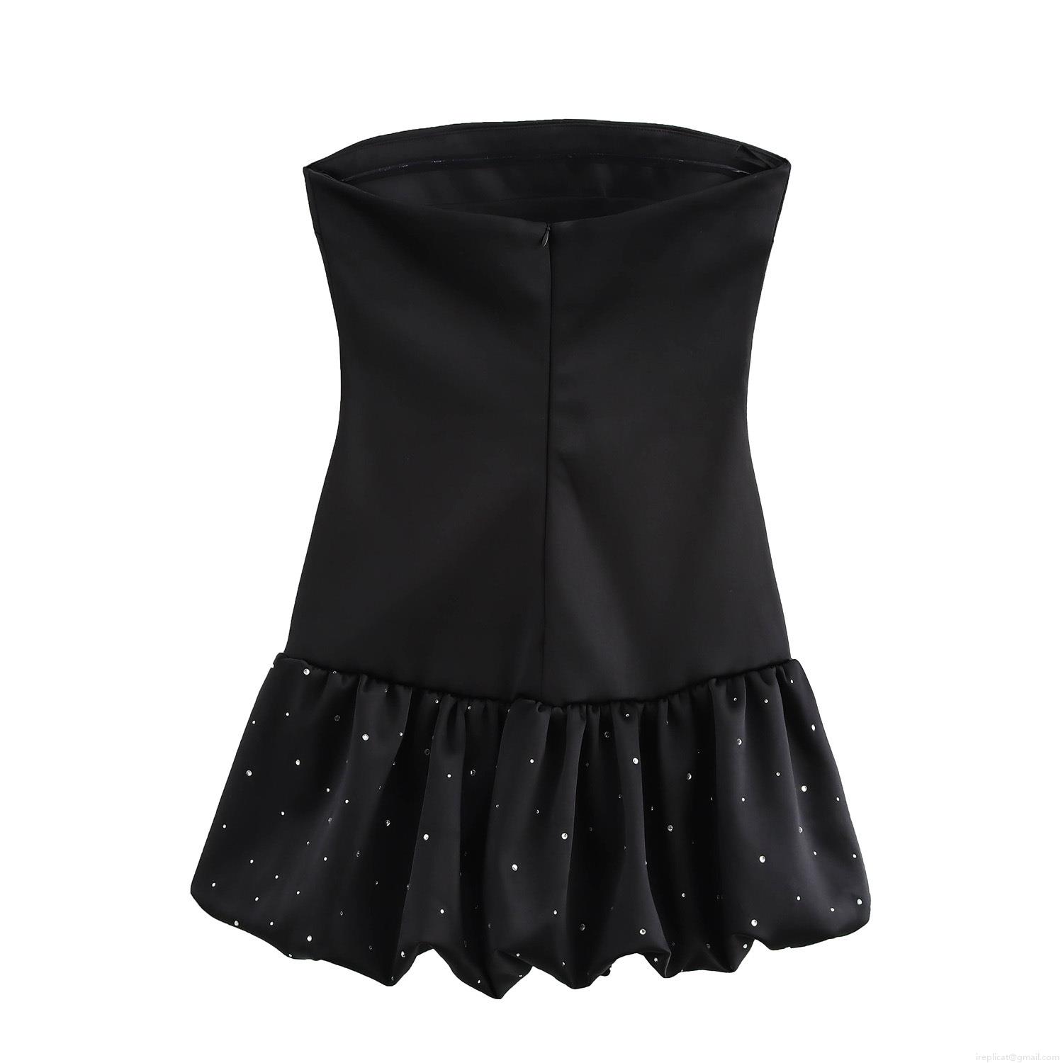 • Women's Sexy Strapless Black Satin Mini Dress With Rhinestone Ruffle Bubble Hem Elegant Party Evening Cocktail Dress Sleeveless Bodycon Dress
