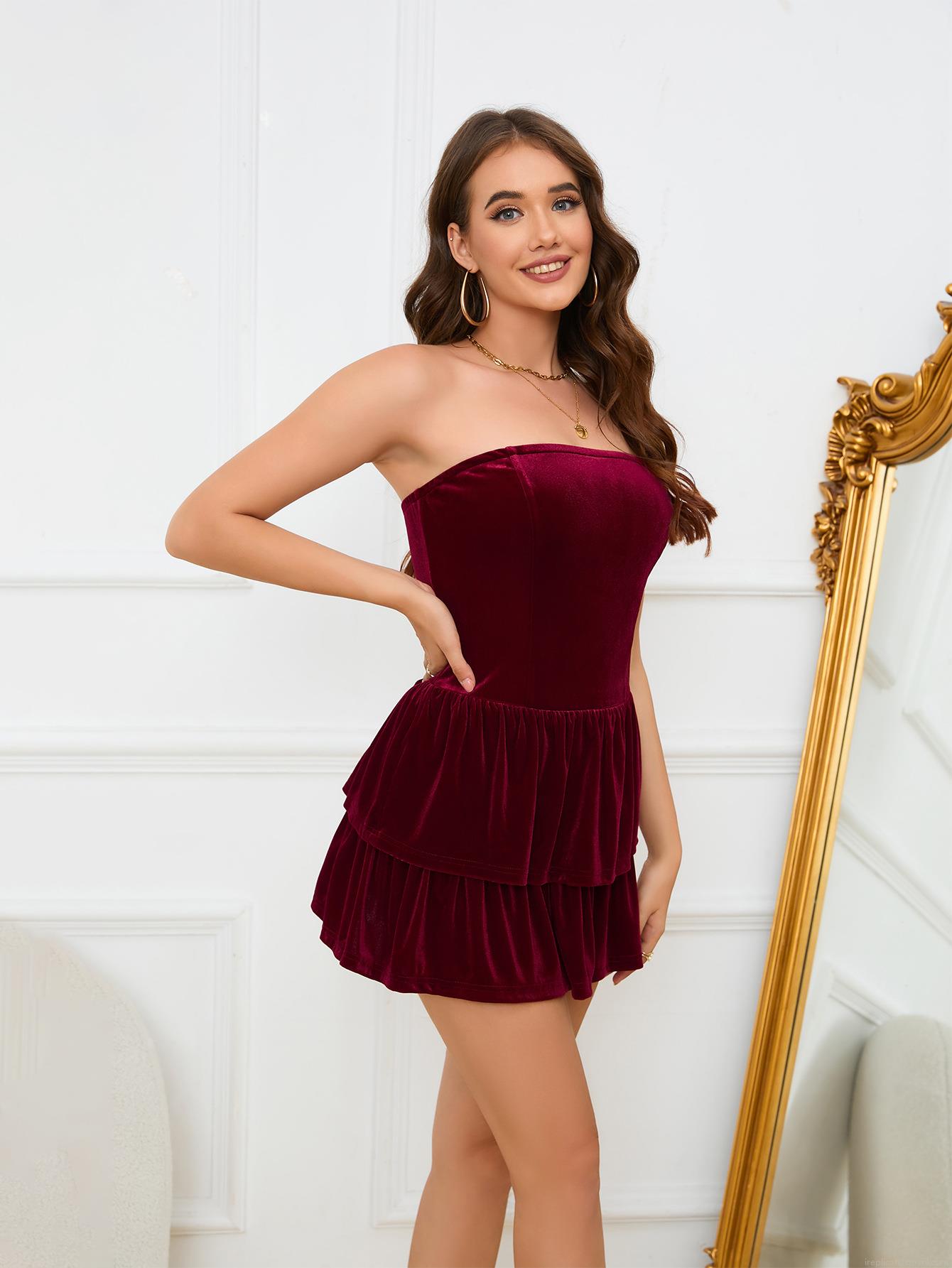• Women's Sexy Strapless Velvet Mini Dress Layered Ruffle Cake Skirt Bodycon Tube Top Party Clubwear Music Festival Wine Red Short Dress