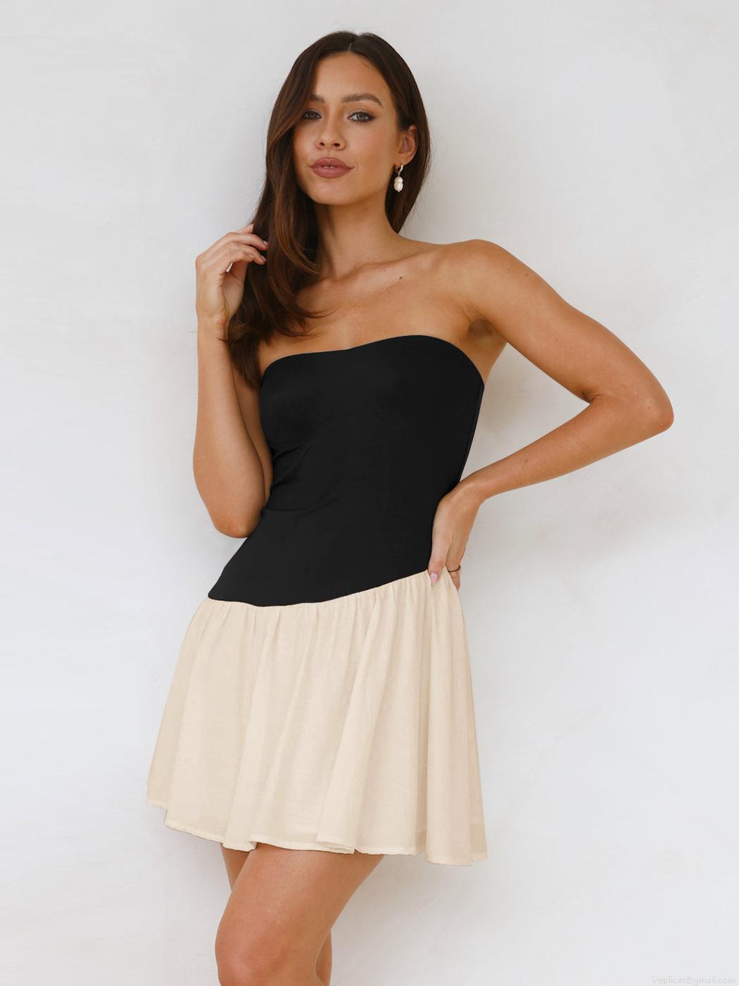 • Women's Sexy Tube Top Patchwork Mini Dress Polyester Spandex Pleated Bodycon Short Dress French Style Elegant Summer Party Outfit For Ladies