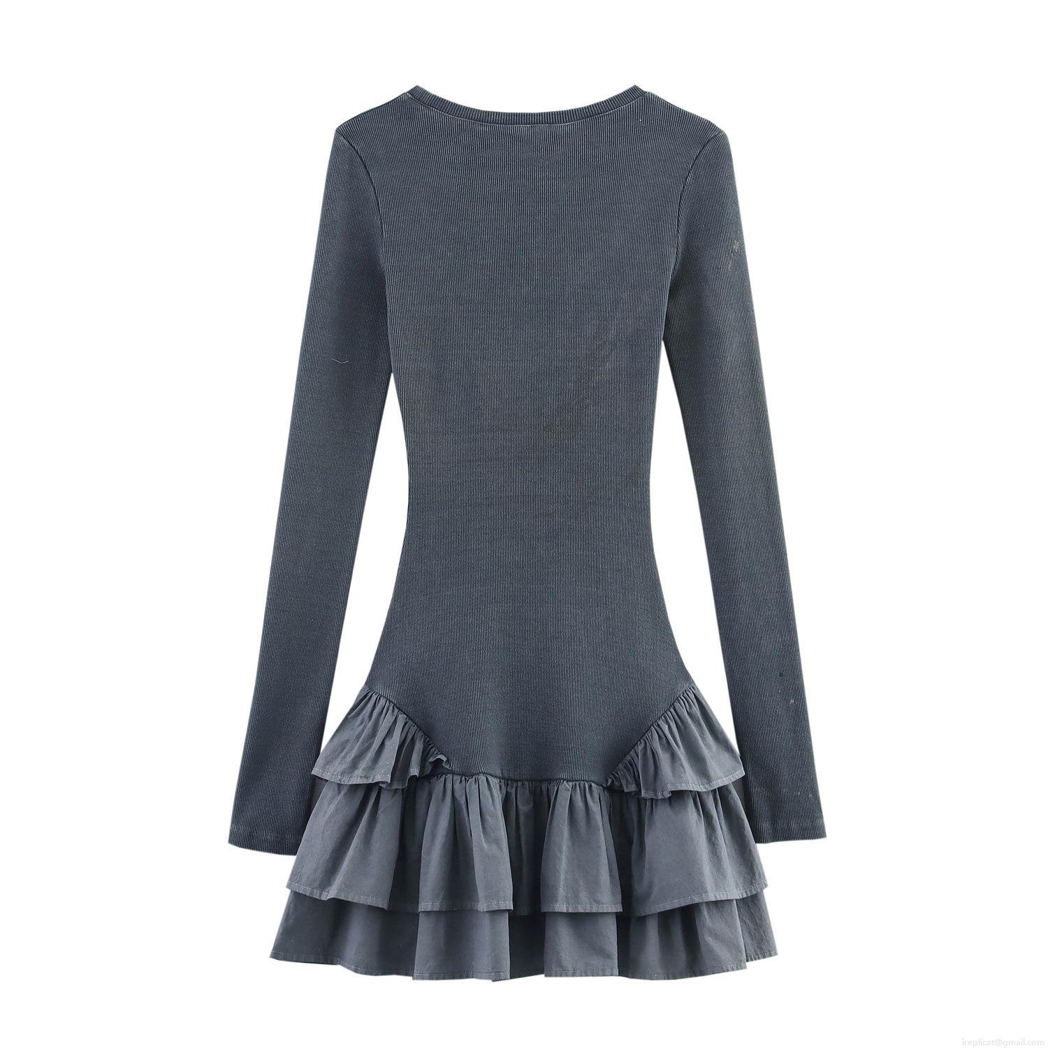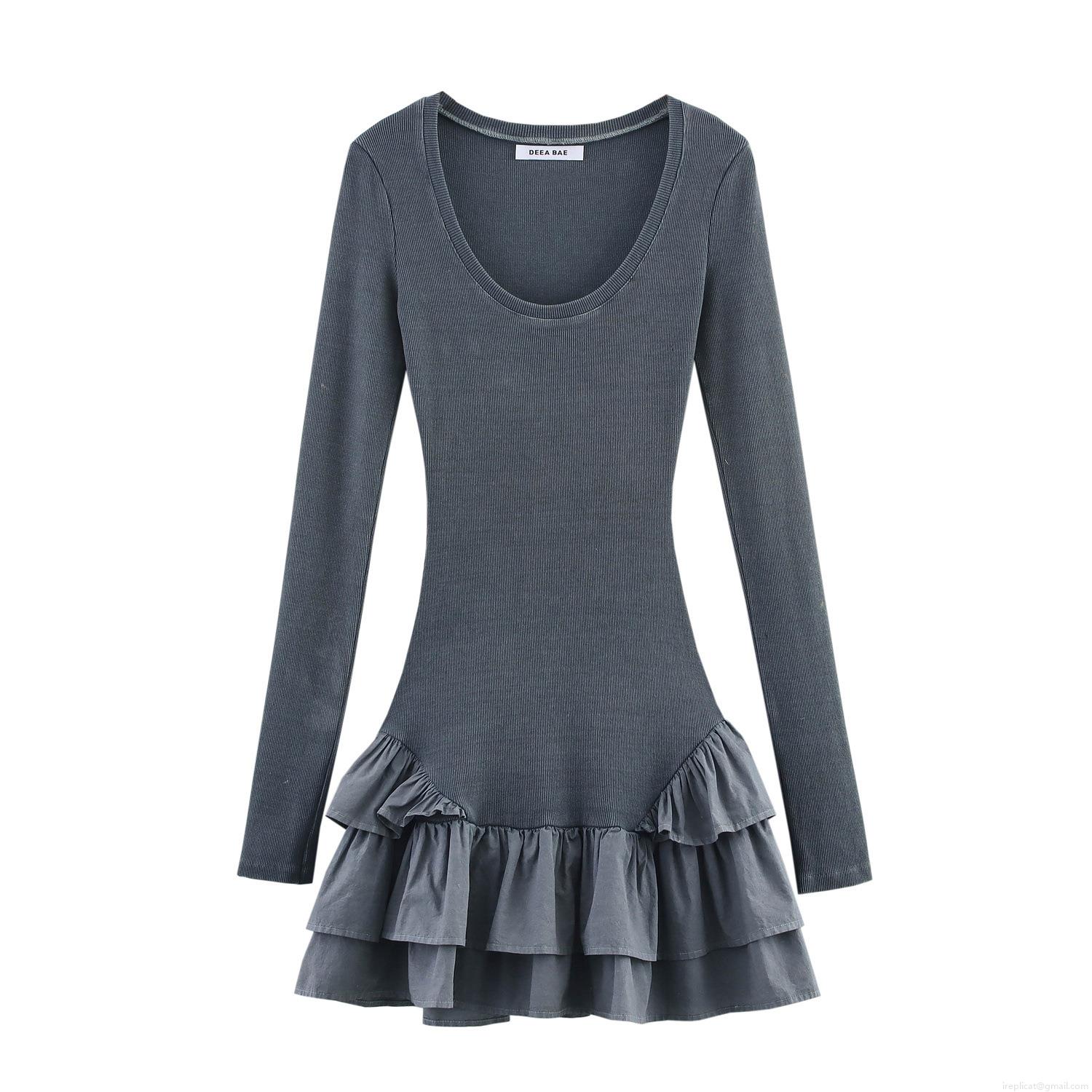 • Women's Sexy U-Neck Long Sleeve Ribbed Knit Mini Dress With Tiered Ruffle Hem Solid Color Wash Effect Slim Fit A-Line Dress For Streetwear Party