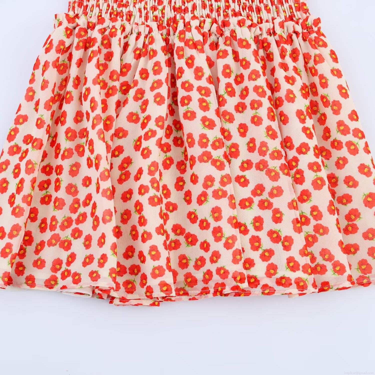 Ruffles, Printing, V-neck, Strapless Shoulder Strap, Elasticity And Tightness, Red And White Floral Pattern