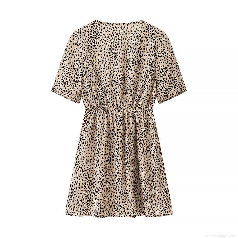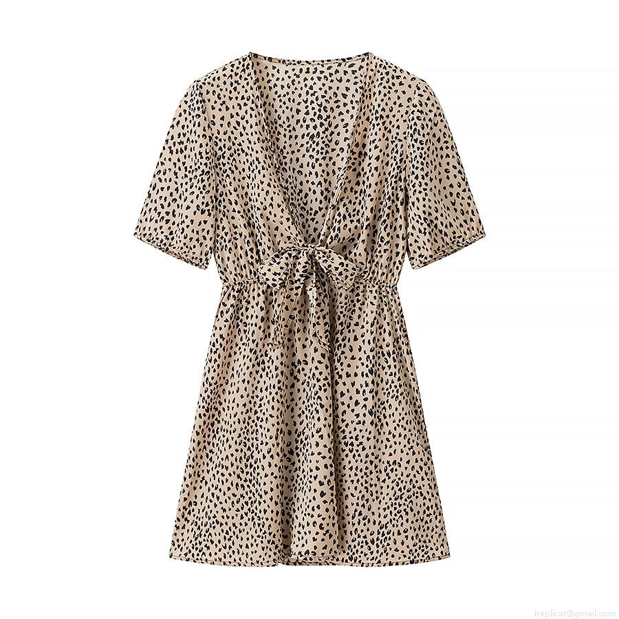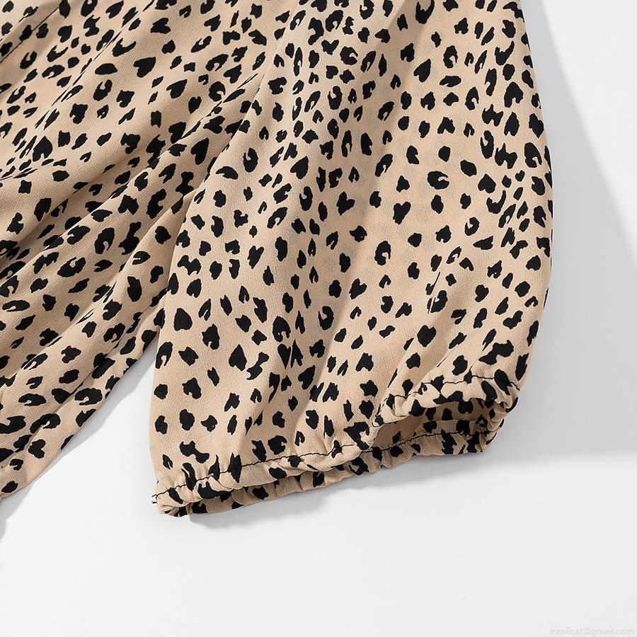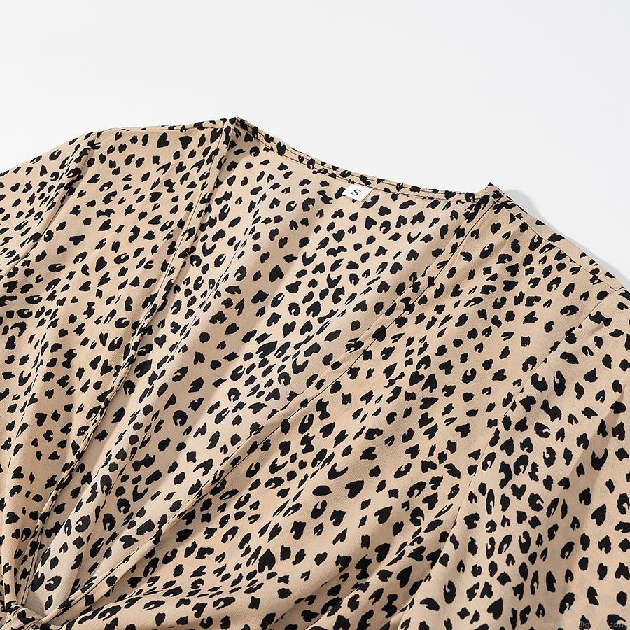 Bow, Leopard Print, Waist shaping, V-neck, Lace, Lotus Leaf Sleeves