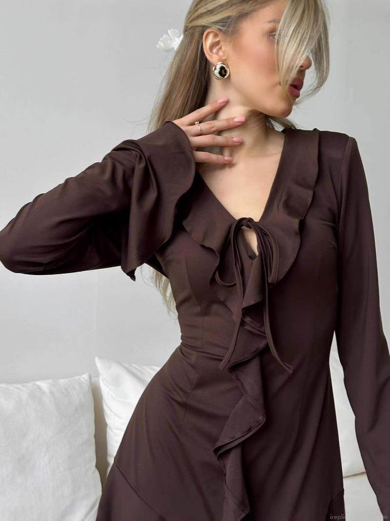 • Women's Sexy V-Neck Ruffle Trim Mini Dress Long Sleeve Tie Front Solid Coffee Brown Cotton Blend Bodycon Dress For Party Club Night Dating Summer