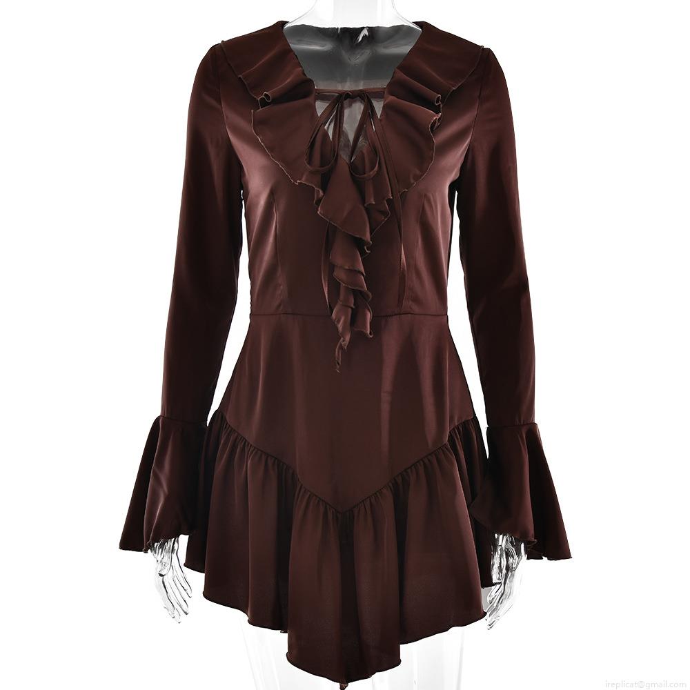 • Women's Sexy V-Neck Satin Ruffle Mini Dress Elegant Long Bell Sleeve Tie-Up Slim Fit Cocktail Party Dress Solid Color Polyester Satin Dress