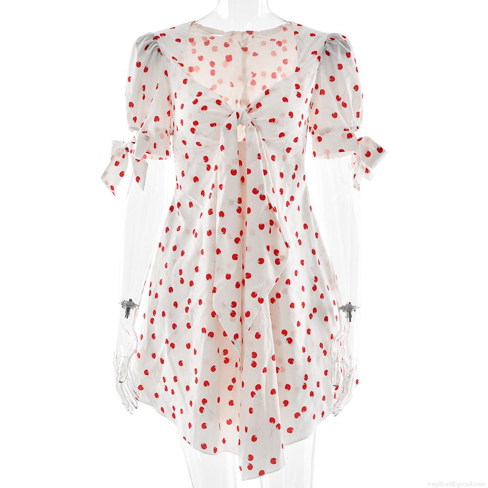 Cherry, Polka Dots, Bow, Ruffles, V-neck, Lace, Puff Sleeves, Irregular Hem