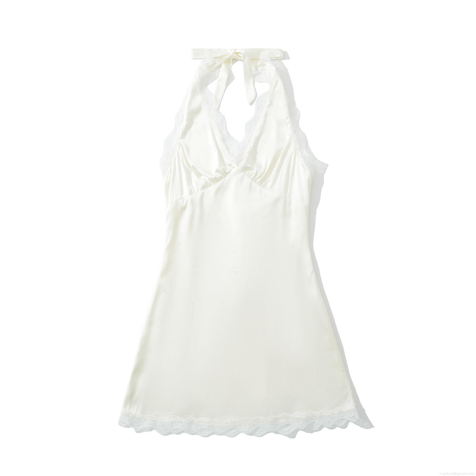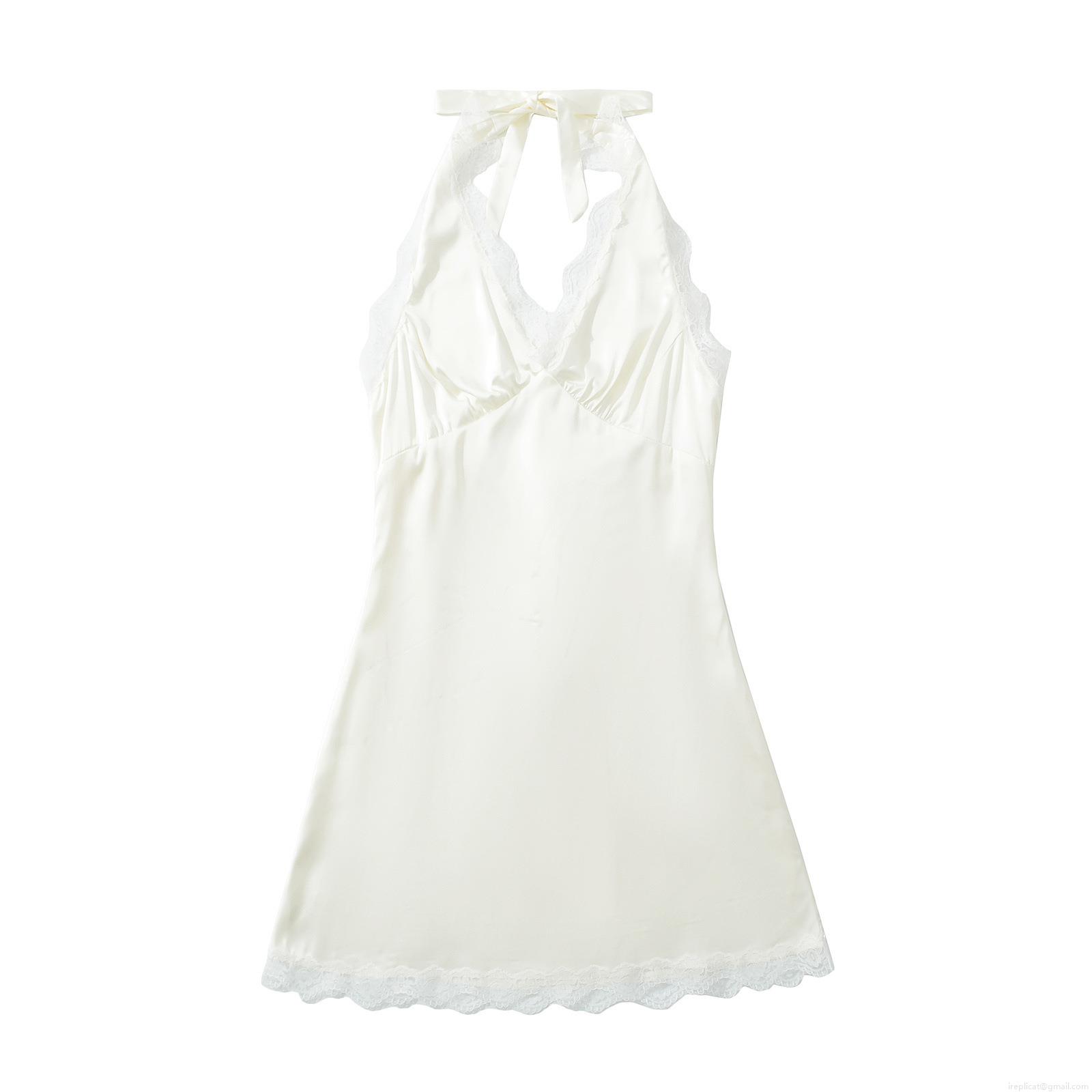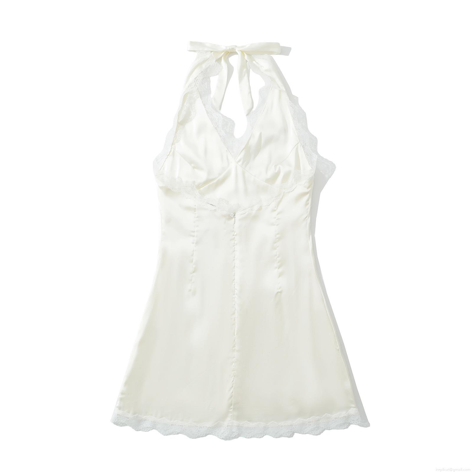 Women's Sexy White Satin Lace Halter Mini Dress Backless Tie-up Neck Sleeveless A-line Nightwear Clubwear Summer Dress