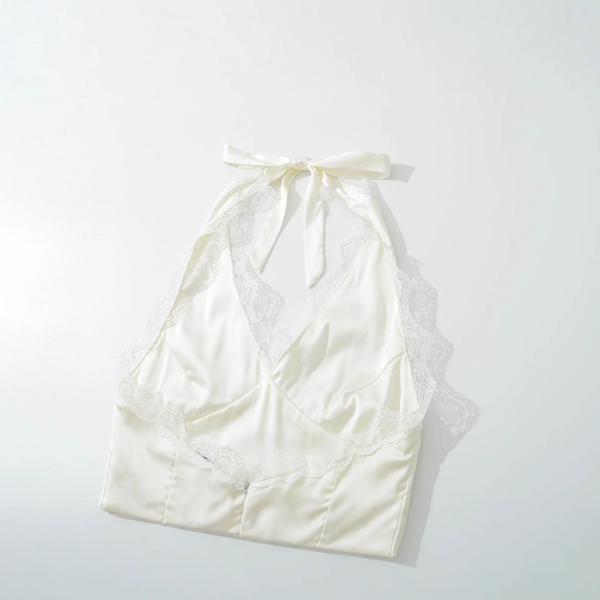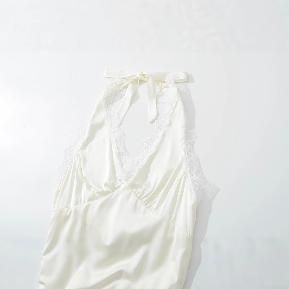 • Women's Sexy White Satin Lace Halter Mini Dress Backless Tie-up Neck Sleeveless A-line Nightwear Clubwear Summer Dress