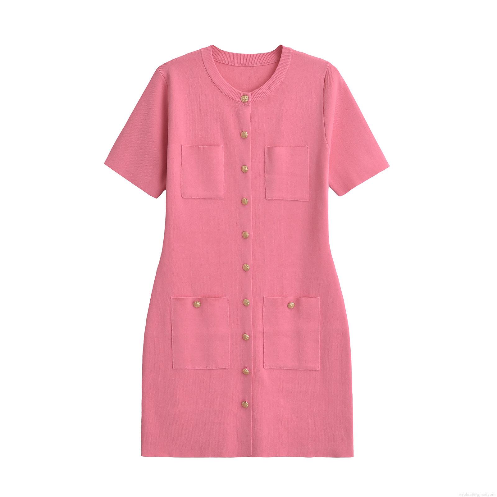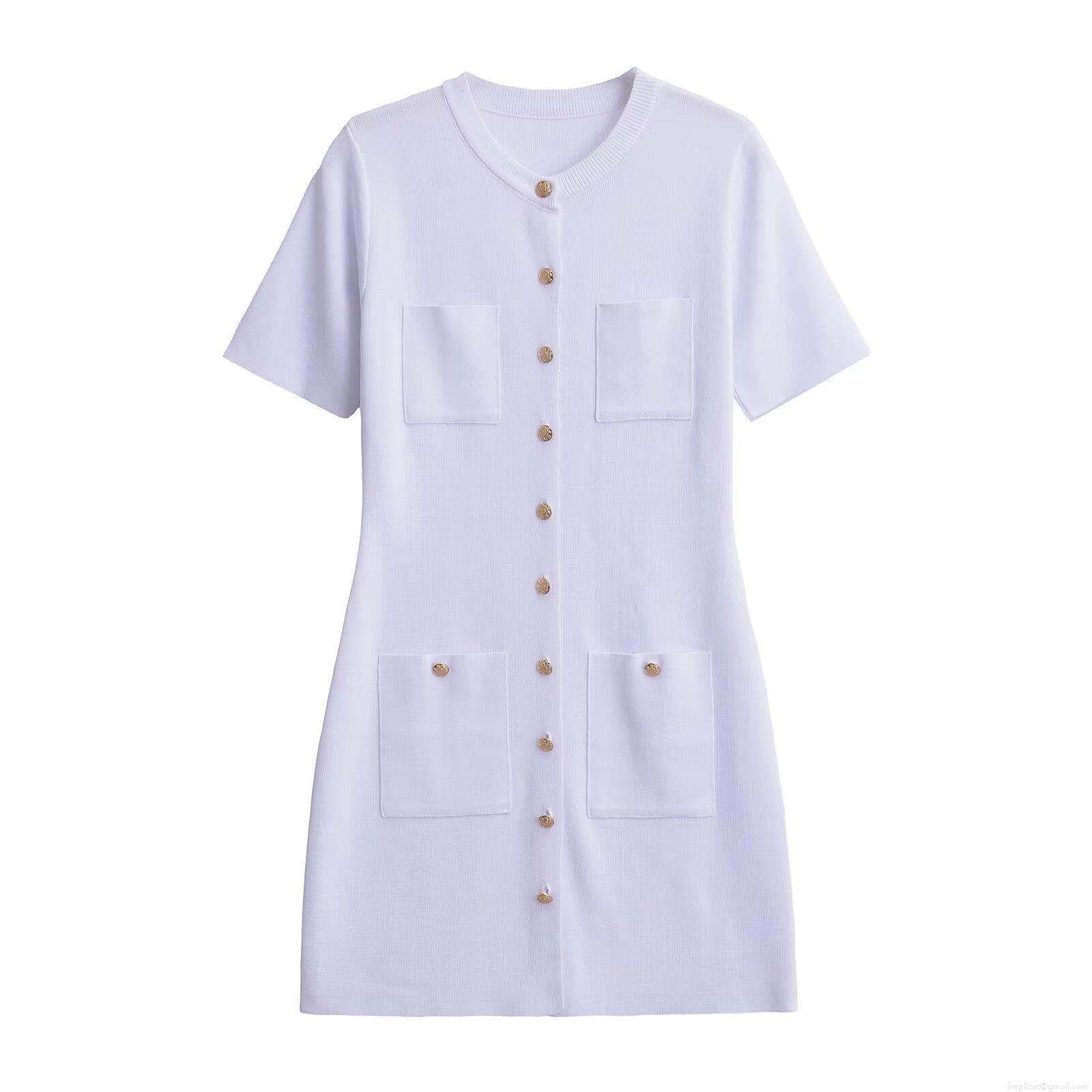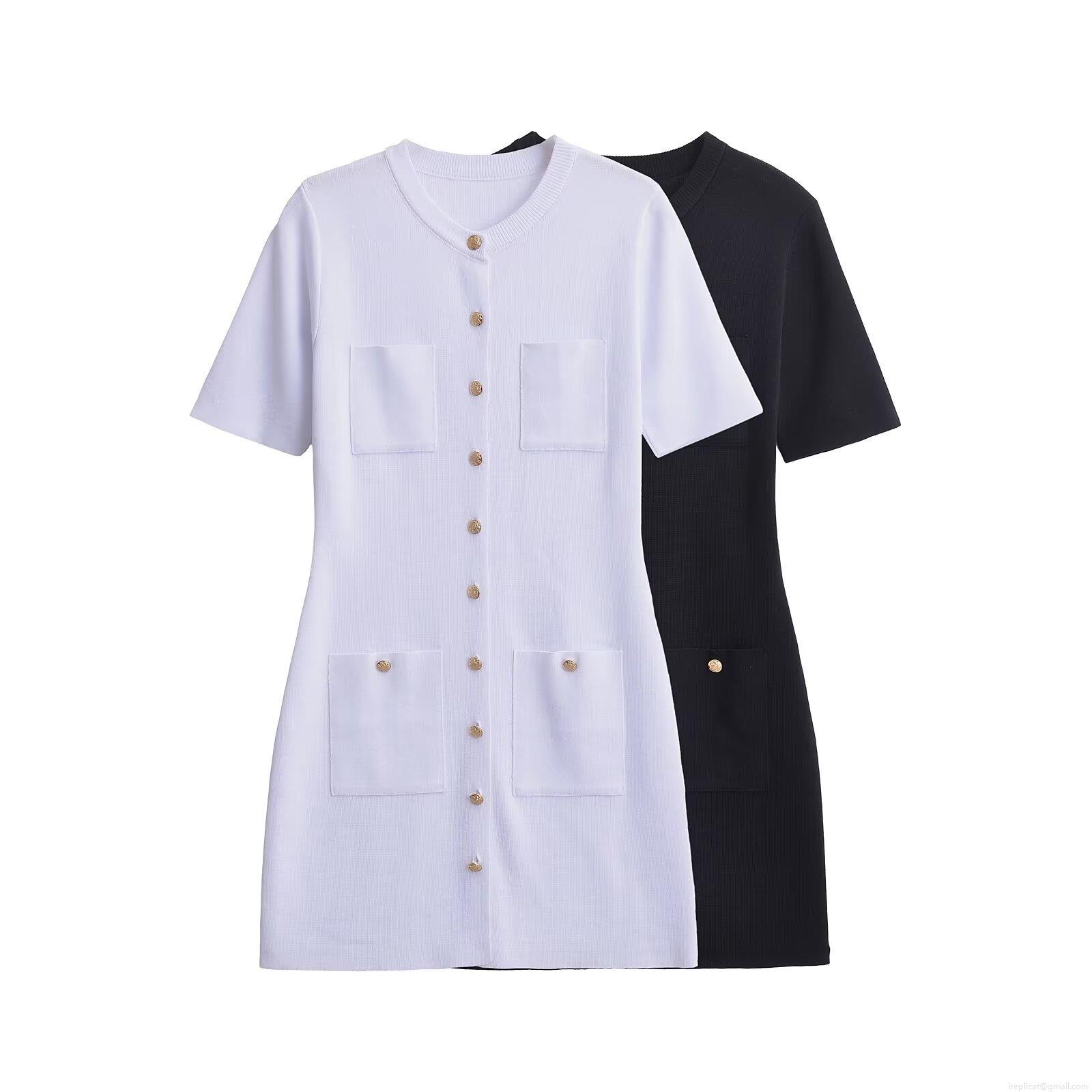 • Women's Short Sleeve Knit Mini Dress With Gold Buttons Four Pockets Round Neck Elegant Slim Fit Bodycon Sheath Dress For Office Party Daily Streetwear Fashion Chic Lady