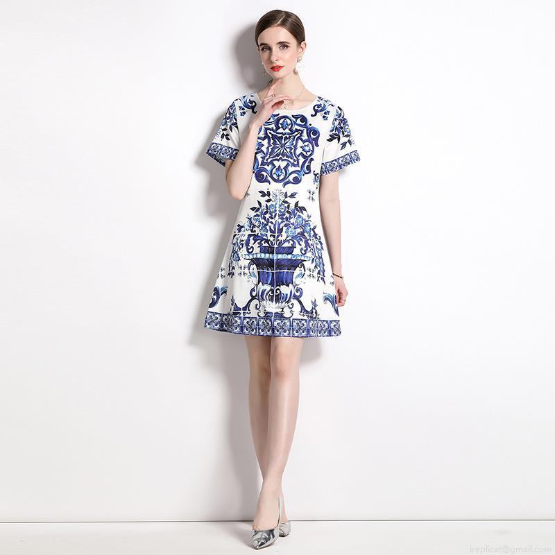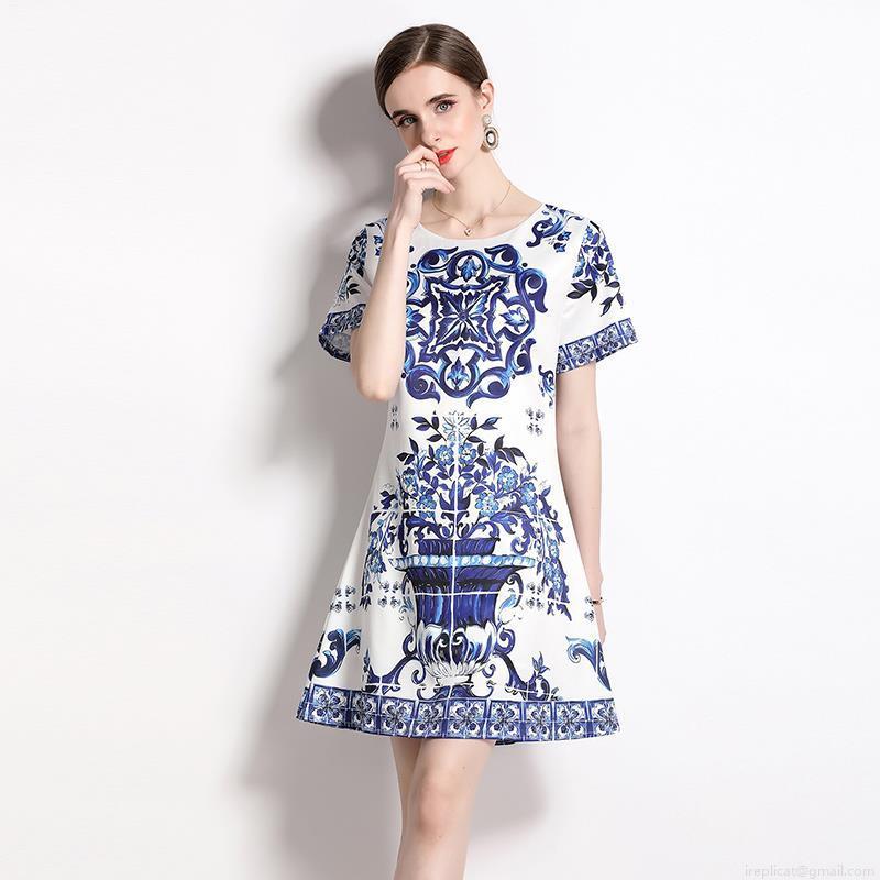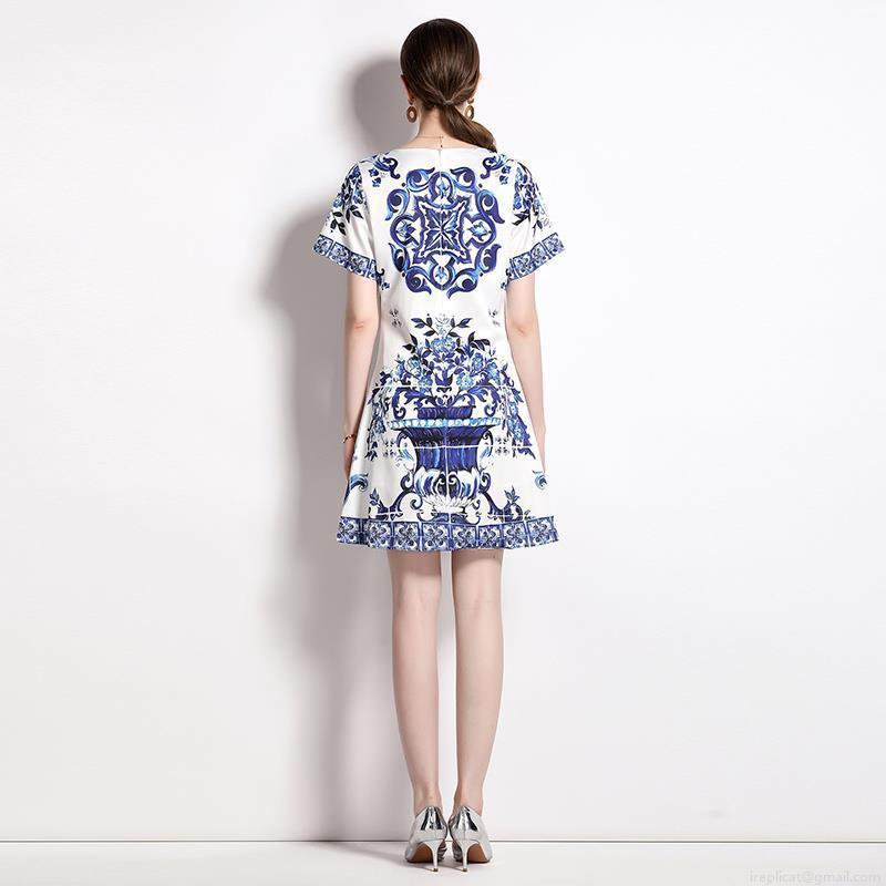 • Women's Short Sleeve Round Neck Blue and White Porcelain Print A-Line Mini Dress With Lining Elegant Majolica Style Slim Fit Polyester Short Dress For Party Vacation Daily Wear