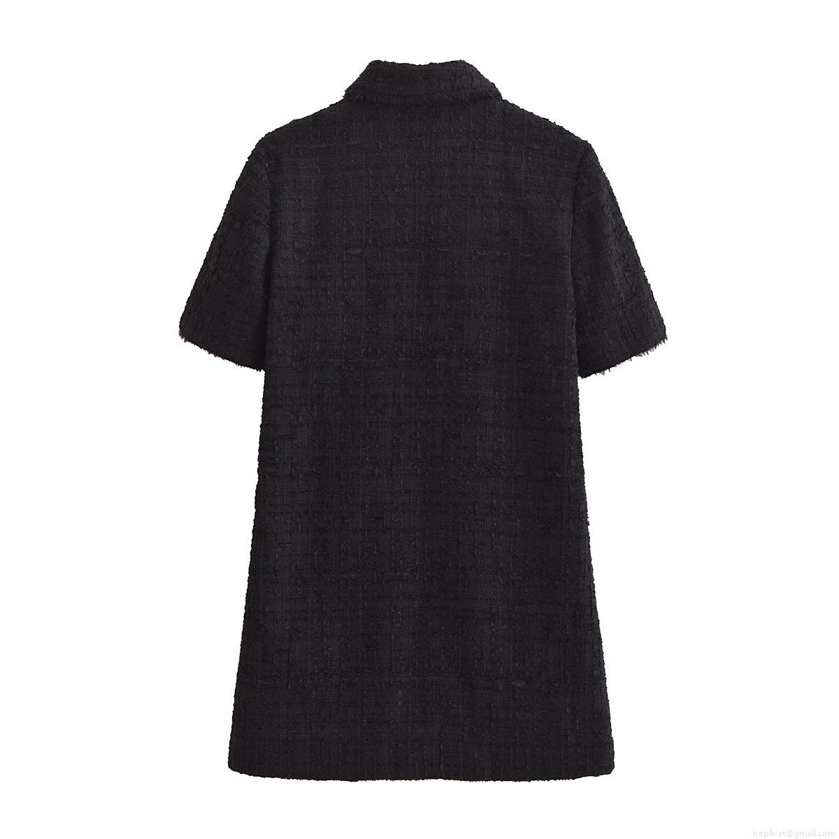 • Women's Short Sleeve Tweed Mini Dress Fashionable Lapel Collar Gold Buttons Fringe Trim A-Line Black Street Style Dress For Women
