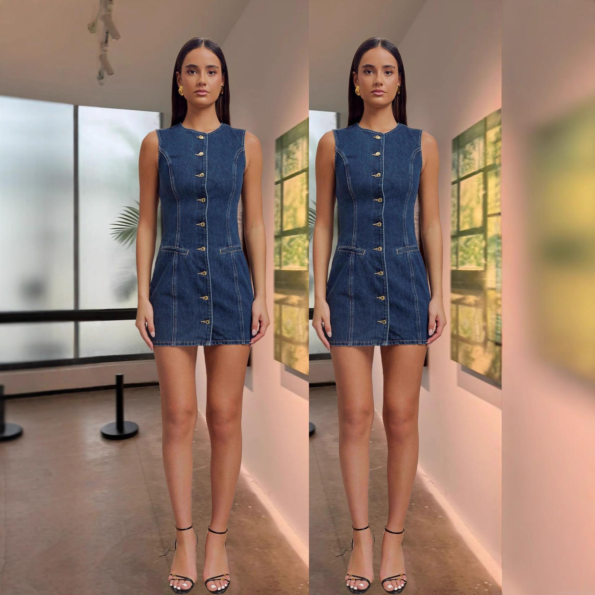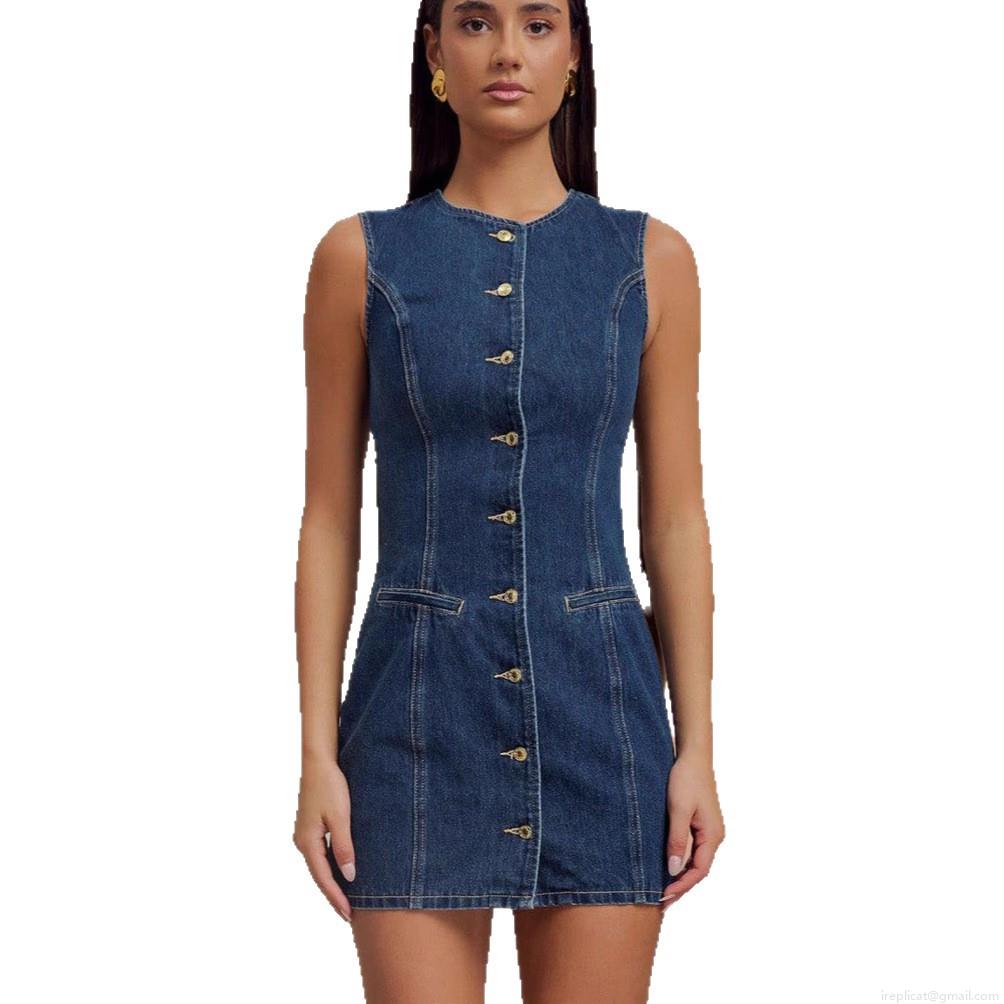 • Women's Sleeveless Denim Mini Dress Casual Slim High Waist Single Breasted Round Neck Dark Blue Short Jean Dress With Metal Buttons