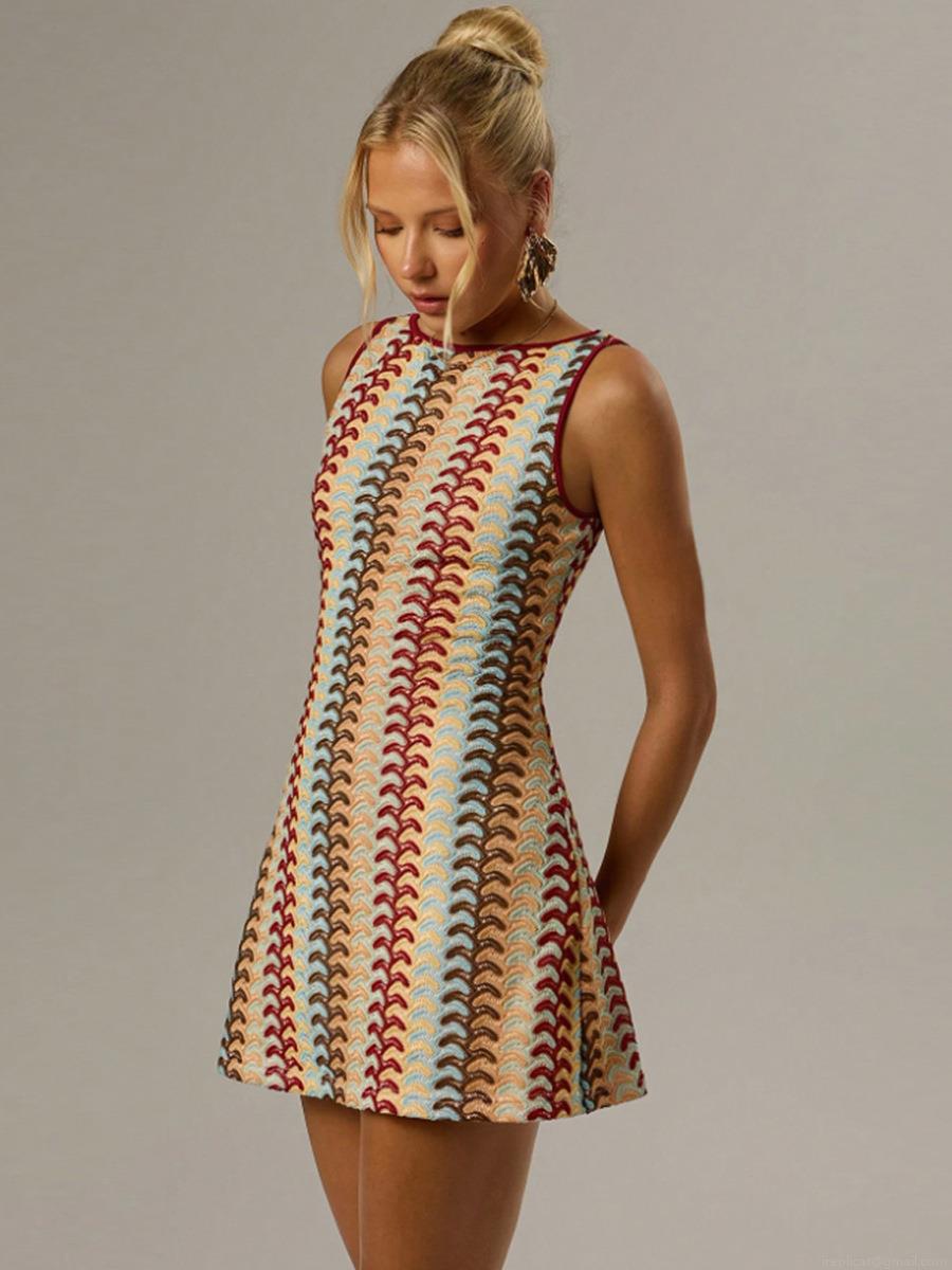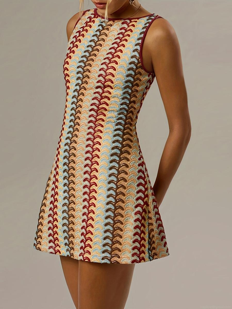 • Women's Sleeveless Knit Mini Dress Retro Wave Pattern Contrast Color Crew Neck Slim Fit A-Line Short Dress For Daily Vacation Party