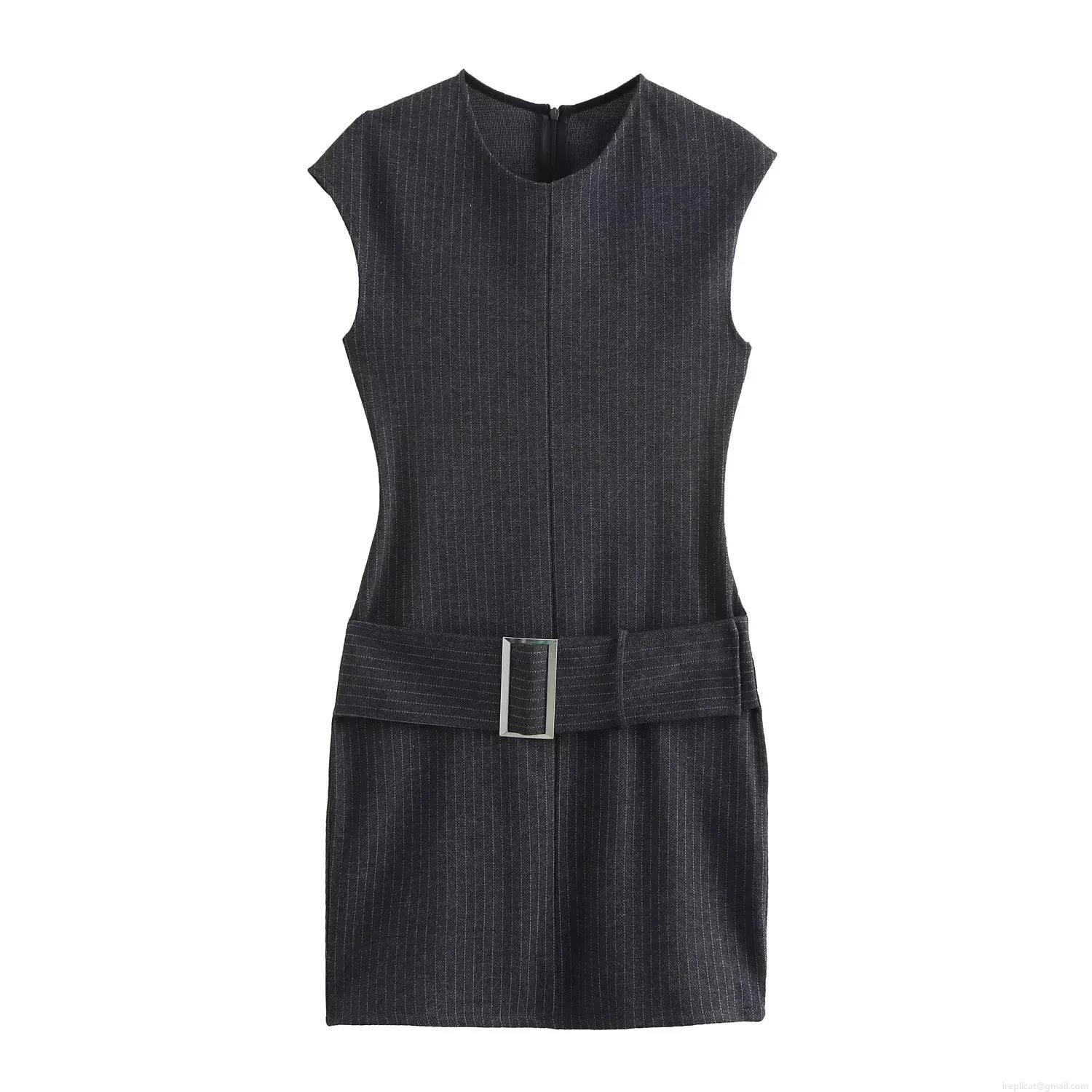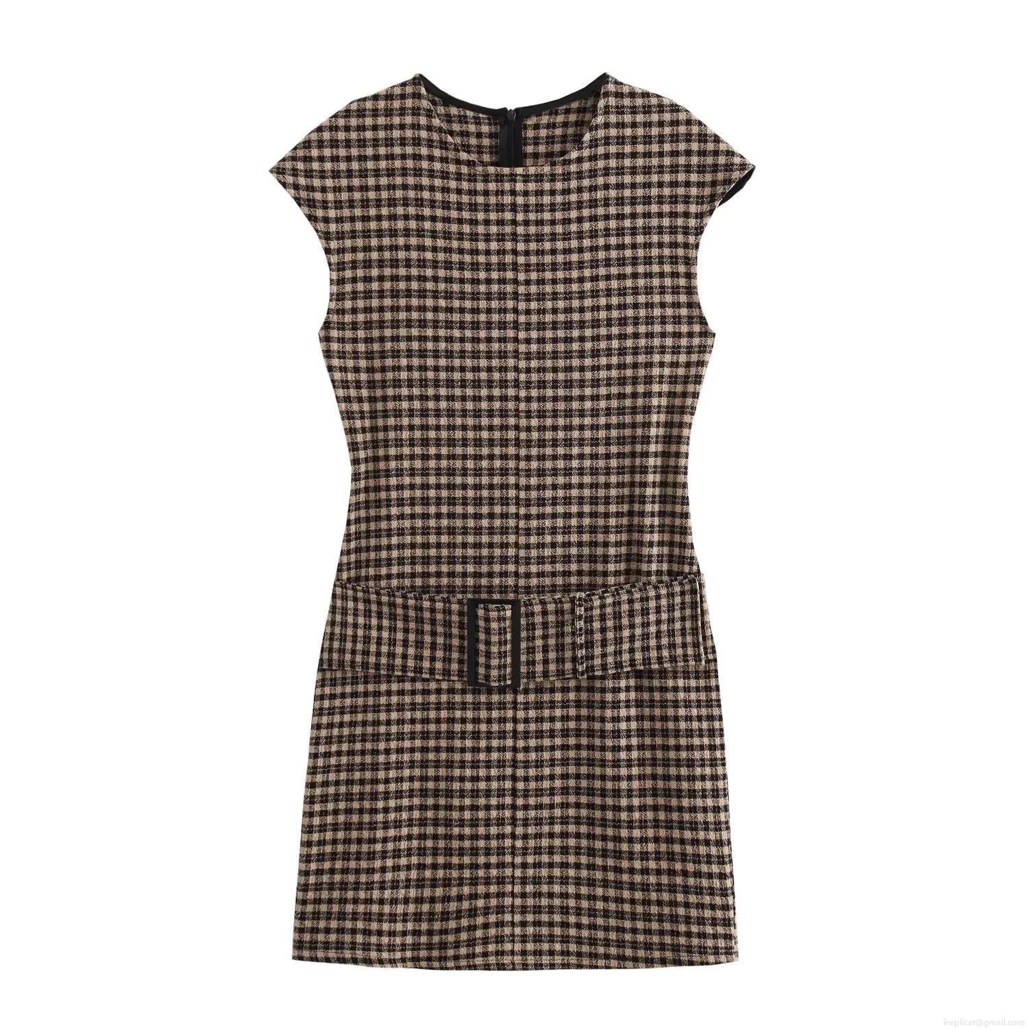 • Women's Sleeveless Mini Dress Elegant Houndstooth Striped Solid Color Crew Neck Slim Fit Short Dress With Matching Belt For Office Dating Party Fashion Outfits