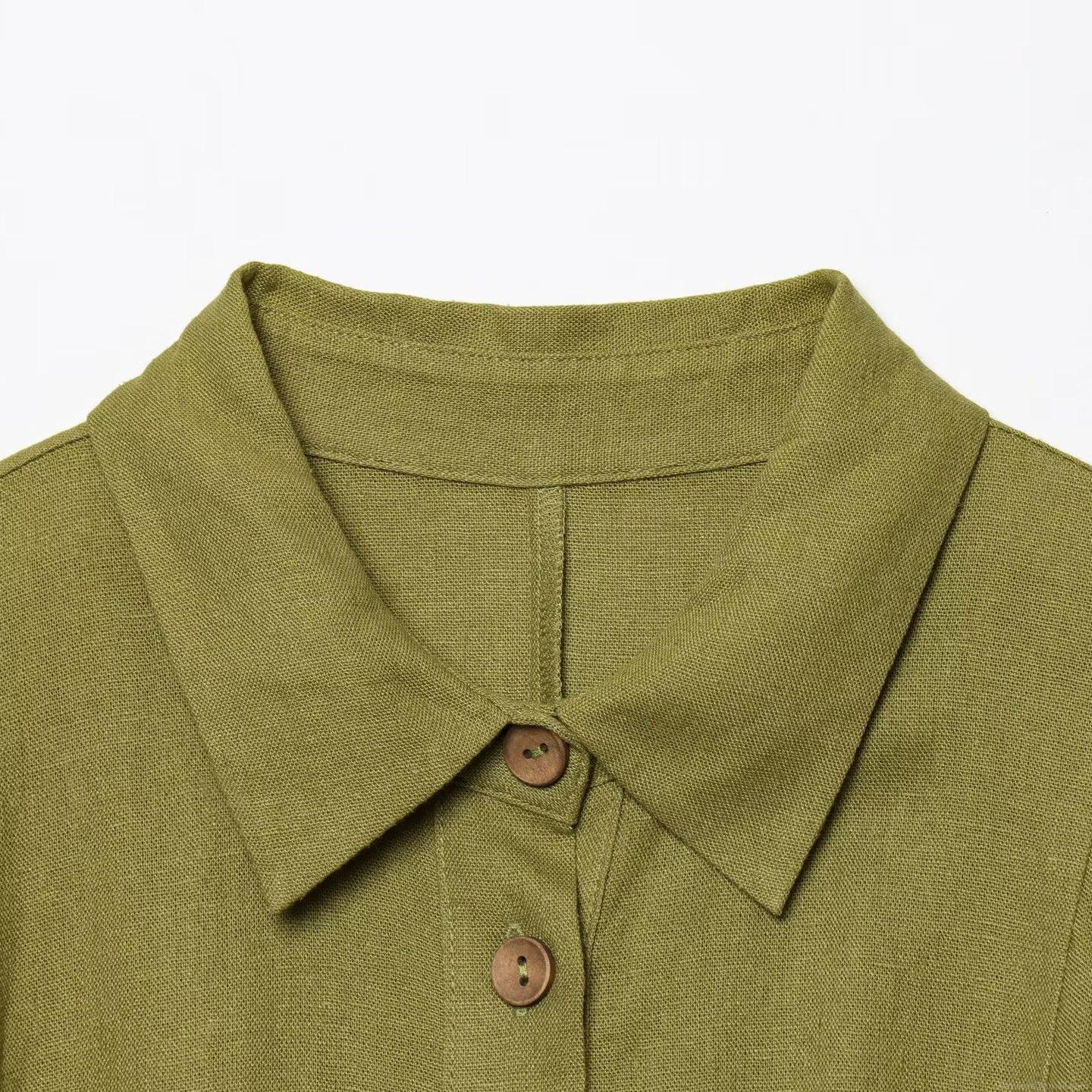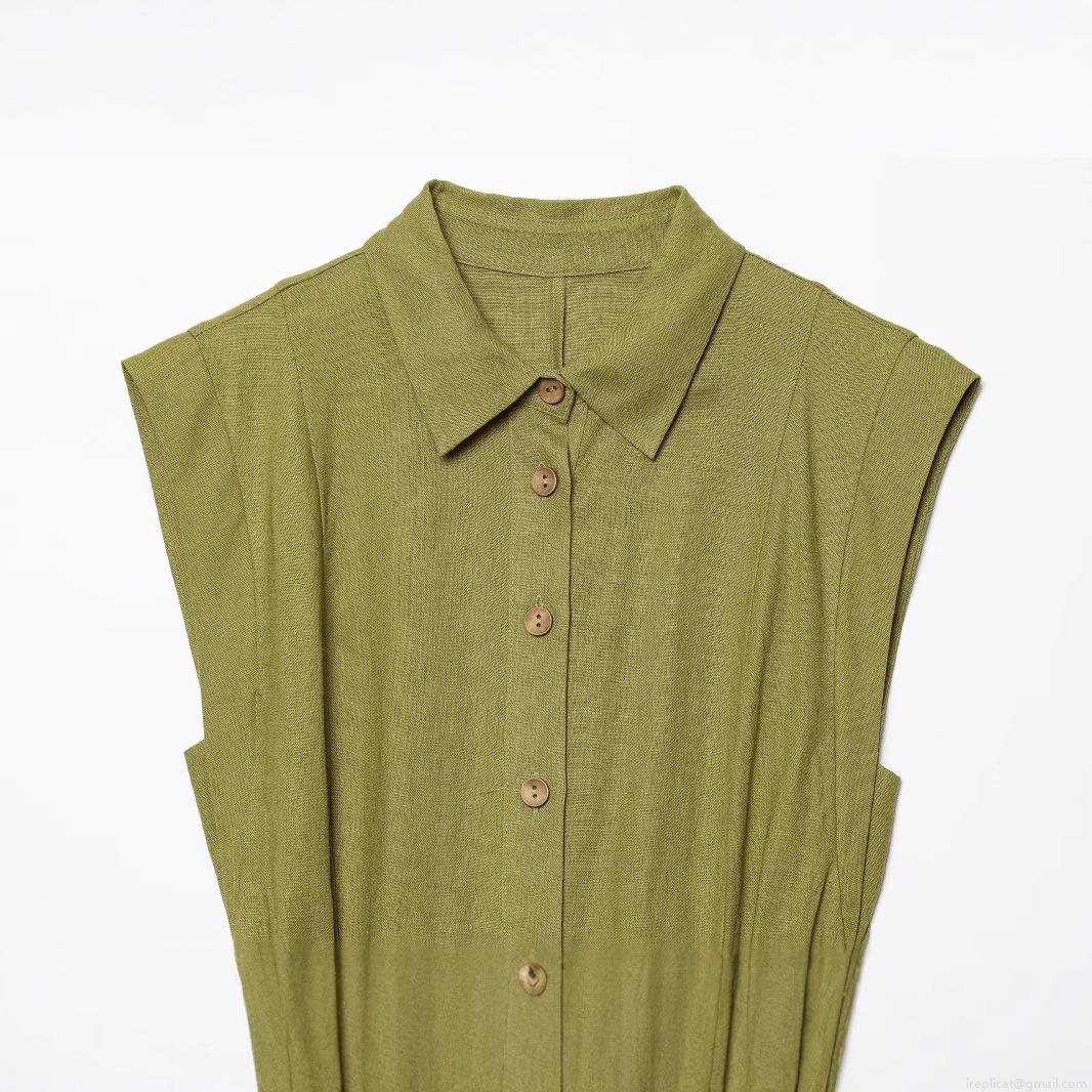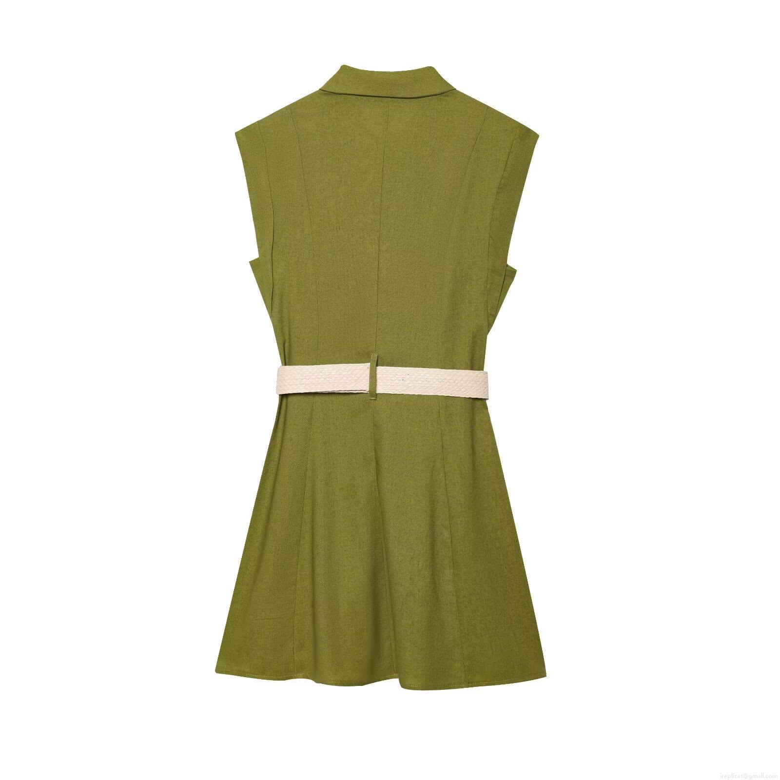 • Women's Sleeveless Olive Green Shirt Mini Dress With Woven Belt Linen Texture Polyester Elegant Button Down Summer Casual Vestidos For Women