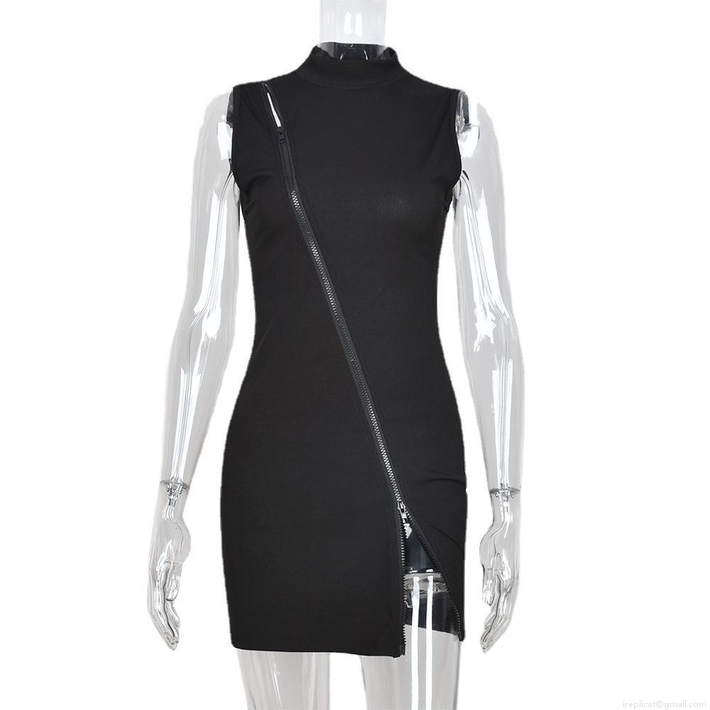 • Women's Sleeveless Ribbed Knit Bodycon Mini Dress Diagonal Zipper Backless Round Neck Slim Fit Solid Color Street Style Autumn Clubwear Outfit