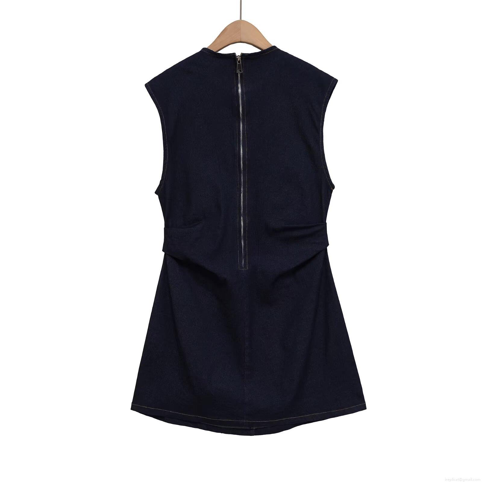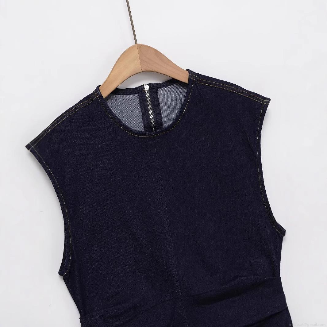 • Women's Sleeveless Round Neck Dark Blue Denim Mini Dress With Back Zipper Waist Pleats Contrast Stitching Casual Elegant Short Dress For Summer Party