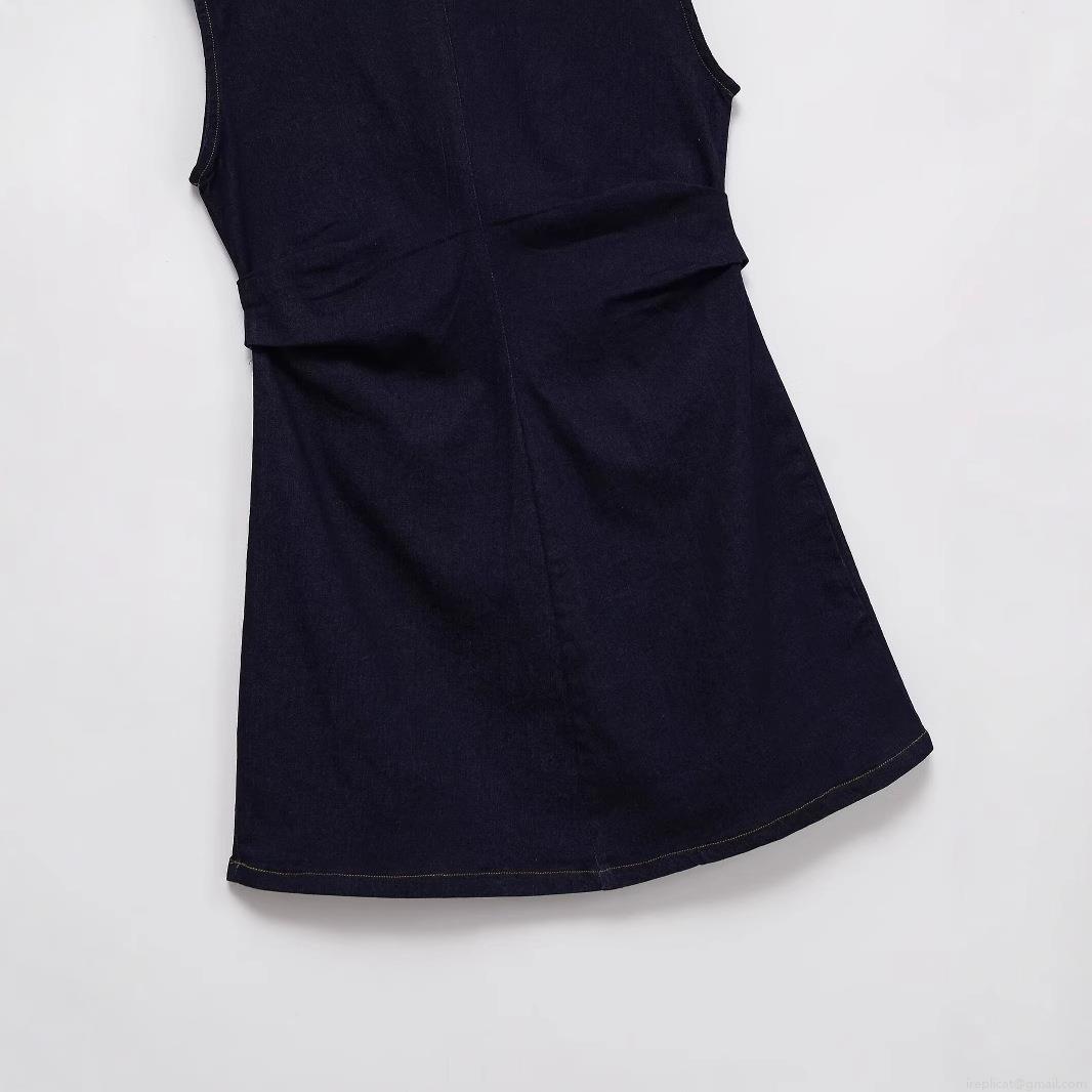 Women's Sleeveless Round Neck Dark Blue Denim Mini Dress With Back Zipper Waist Pleats Contrast Stitching Casual Elegant Short Dress For Summer Party