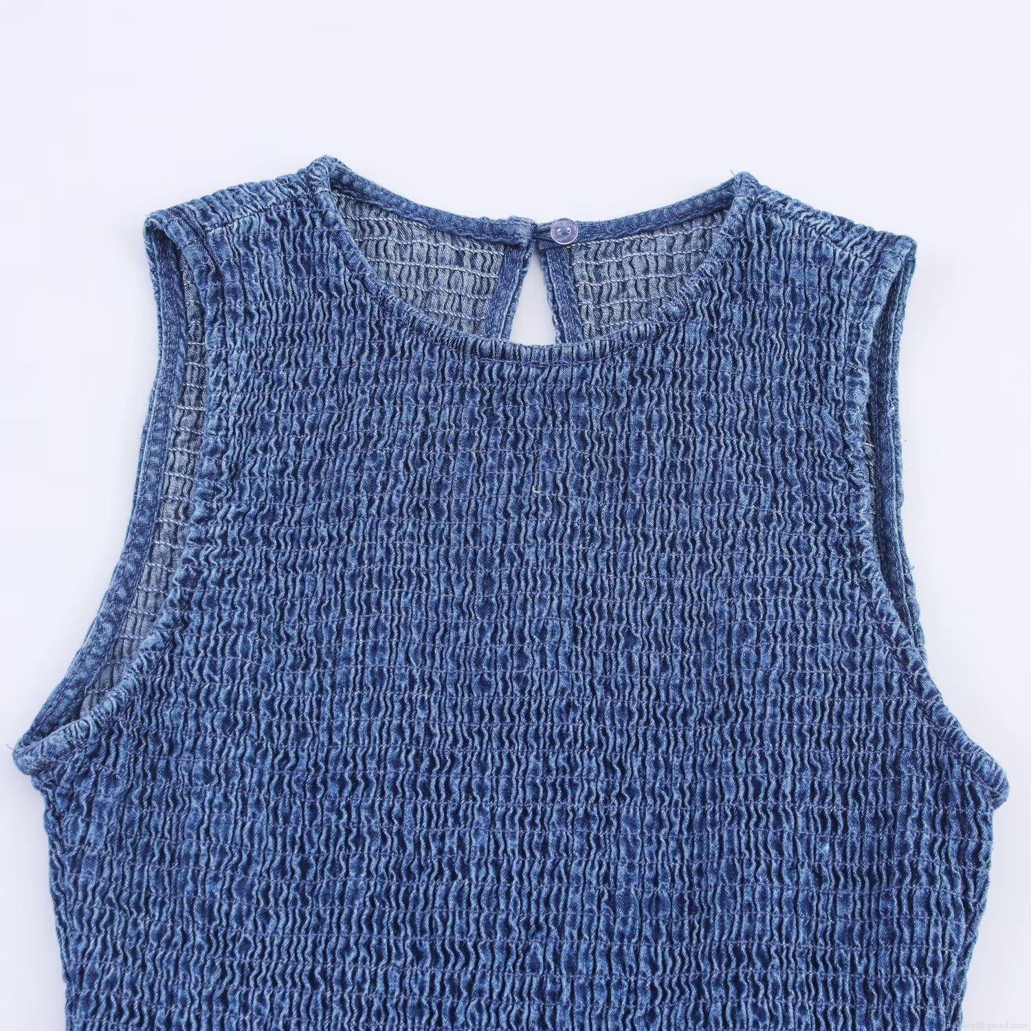 Women's Sleeveless Smocked Mini Dress Round Neck A-Line Imitation Denim Sundress Summer Casual Party Sweet Style Solid Blue Dress